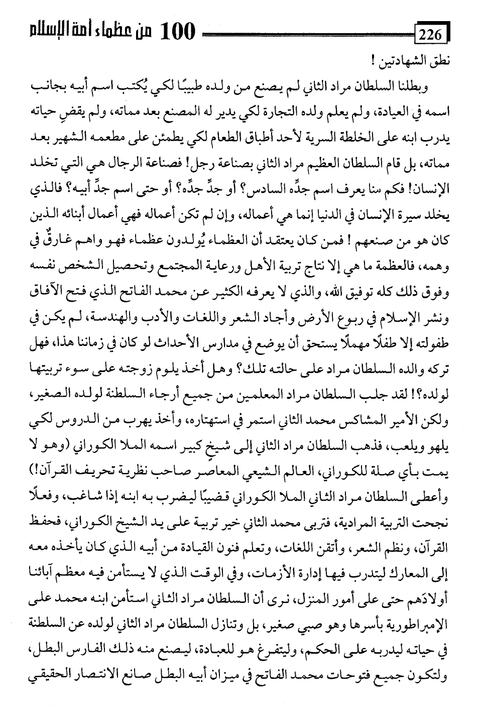 وبطلنا السلطان مراد الثاني لم يصنع من ولده طبيبًا لكي يُكتب اسم أبيه بجانب اسمه في العيادة، ولم يعلم ولده التجارة لكي يدير له المصنع بعد مماته، ولم يقضِ حياته يدرب ابنه على الخلطة السرية لأحد أطباق الطعام لكي يطمئن على مطعمه الشهير بعد مماته، بل قام السلطان العظيم مراد الثاني بصناعة رجل! فصناعة الرجال هي التي تخلد الإنسان! فكم سنا يعرف اسم جدِّه السادس؟ أو جدِّ جدِّه؟ أو حتى اسم جدِّ أبيه؟ فالذي يخلد سيرة الإنسان في الدنيا إنما هي أعماله، وإن لم تكن أعماله فهي أعمال أبنائه الذين كان هو من صنعهم! فمن كان يعتقد أن العظماء يُولدون عظماء فهو واهم غارقٌ في وهمه، فالعظمة ما هي إلا نتاج تربية الأهل ورعاية المجتمع وتحصيل الشخص نفسه وفوق ذلك كله توفيق اللَّه، والذي لا يعرفه الكثير عن محمَّد الفاتح الذي فتح الآفاق ونشر الإِسلام في ربوع الأرض وأجاد الشعر واللغات والأدب والهندسة، لم يكن في طفولته إلا طفلًا مهملًا يستحق أن يوضع في مدارس الأحداث لو كان في زماننا هذا، فهل تركه والده السلطان مراد على حالته تلك؟ وهل أخذ يلوم زوجته على سوء تربيتها لولده؟! لقد جلب السلطان مراد المعلمين من جميع أرجاء السلطنة لولده الصغير, ولكن الأمير المشاكس محمَّد الثاني استمر في استهتاره، وأخذ يهرب من الدروس لكي يلهو ويلعب، فذهب السلطان مراد الثاني إلى شيخٍ كبير اسمه الملا الكوراني (وهو لا يمت بأي صلة للكوراني، العالم الشيعي المعاصر صاحب نظرية تحريف القرآن!) وأعطى السلطان مراد الثاني الملا الكوراني قضيبًا ليضرب به ابنه إذا شاغب، وفعلًا نجحت التربية المرادية، فتربى محمَّد الثاني خير تربية على يد الشيخ الكوراني، فحفظ القرآن، ونظم الشعر، وأتقن اللغات، وتعلم فنون القيادة من أبيه الذي كان يأخذه معه إلى المعارك ليتدرب فيها إدارة الأزمات، وفي الوقت الذي لا يستأمن فيه معظم آبائنا أولادَهم حتى على أمور المنزل، نرى أن السلطان مراد الثاني استأمن ابنه محمَّد على الإمبراطورية بأسرها وهو صبي صغير، بل وتنازل السلطان مراد الثاني لولده عن السلطنة في حياته ليدربه على الحكم، وليتفرغ هو للعبادة، ليصنع منه ذلك الفارس البطل، ولتكون جميع فتوحات محمَّد الفاتح في ميزان أبيه البطل صانع الانتصار الحقيقي