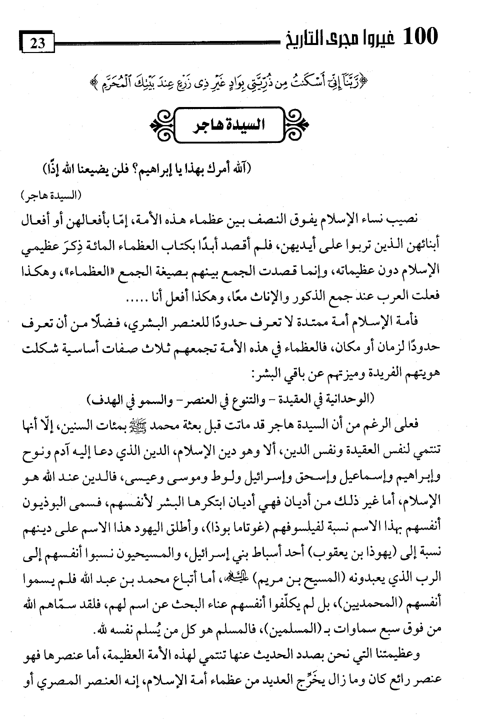 نصيب نساء الإسلام يفوق النصف بين عظماء هذه الأمة، إمّا بأفعالهن أو أفعال أبنائهن الذين تربوا على أيديهن، فلم أقصد أبدًا بكتاب العظماء المائة ذِكرَ عظيمي الإسلام دون عظيماته، وإنما قصدت الجمع بينهم بصيغة الجمع "العظماء"، وهكذا