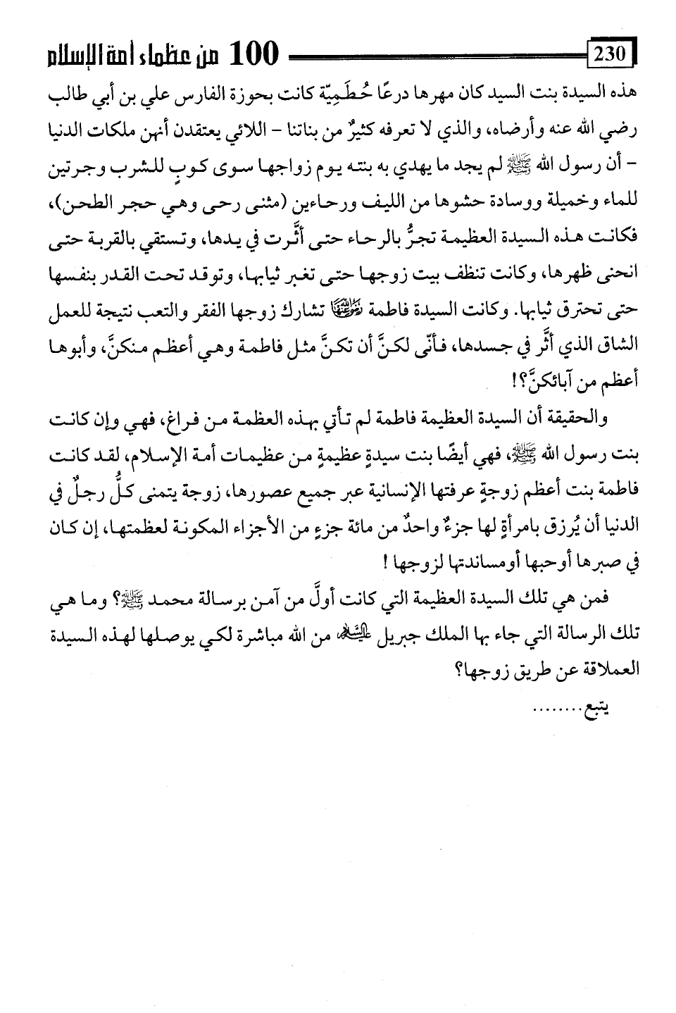 هذه السيدة بنت السيد كان مهرها درعًا حُطَمِية كانت بحوزة الفارس علي بن أبي طالب رضي اللَّه عنه وأرضاه، والذي لا تعرفه كثيرٌ من بناتنا -اللائي يعتقدن أنهن ملكات الدنيا- أن رسول اللَّه -صلى اللَّه عليه وسلم- لم يجد ما يهدي به بنته يوم زواجها سوى كوبٍ للشرب وجرتين للماء وخميلة ووسادة حشوها من الليف ورحاءين (مثنى رحى وهي حجر الطحن)، فكانت هذه السيدة العظيمة تجرُّ بالرحاء حتى أثَّرت في يدها، وتستقي بالقربة حتى انحنى ظهرها، وكانت تنظف بيت زوجها حتى تغير ثيابها، وتوقد تحت القدر بنفسها حتى تحترق ثيابها. وكانت السيدة فاطمة -رضي اللَّه عنها- تشارك زوجها الفقر والتعب نتيجة للعمل الشاق الذي أثَّر في جسدها، فأنّى لكن أن تكنَّ مثل فاطمة وهي أعظم منكنَّ، وأبوها أعظم من آبائكنَّ؟!