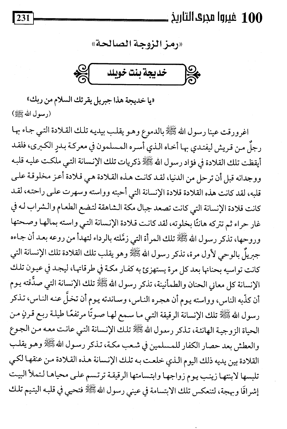 اغرورقت عينا رسول اللَّه -صلى اللَّه عليه وسلم- بالدموع وهو يقلب بيديه تلك القلادة التي جاء بها رجل من قريش ليفتدي بها أخاه الذي أسره المسلمون في معركة بدرٍ "الكبرى" فلقد أيقظت تلك القلادة في فؤاد رسول اللَّه -صلى اللَّه عليه وسلم- ذكريات تلك الإنسانة التي ملكت عليه قلبه ووجدانه قبل أن ترحل من الدنيا، لقد كانت هذه القلادة هي قلادة أعز مخلوقة على قلبه، لقد كانت هذه القلادة قلادة الإنسانة التي أحبته وواسته وسهرت على راحته، لقد كانت قلادة الإنسانة التي كانت تصعد جبال مكة الشاهقة لتضع الطعام والشراب له في غار حراء ثم تتركه هانئًا بخلوته، لقد كانت قلادة الإنسانة التي واسته بمالها وصحتها وروحها، تذكر رسول اللَّه -صلى اللَّه عليه وسلم- تلك المرأة التي زمَّلته بالرداء لتهدأ من روعه بعد أن جاءه جبريل بالوحي لأول مرة، تذكر رسول اللَّه -صلى اللَّه عليه وسلم- وهو يقلب تلك القلادة تلك الإنسانة التي كانت تواسيه بحنانها بعد كل مرة يستهزئ به كفار مكة في طرقاتها, ليجد في عيون تلك الإنسانة كل معاني الحنان والطمأنينة، تذكر رسول اللَّه -صلى اللَّه عليه وسلم- تلك الإنسانة التي صدقته يوم أن كذّبه الناس، وواسته يوم أن هجره الناس، وساندته يوم أن تخل عنه الناس، تذكر رسول اللَّه -صلى اللَّه عليه وسلم- تلك الإنسانة الرقيقة التي ما سمع لها صوتًا مرتفعًا طيلة ربع قرنٍ من الحياة الزوجية الهانئة، تذكر رسول اللَّه -صلى اللَّه عليه وسلم- تلك الإنسانة التي عانت معه من الجوع والعطش بعد حصار الكفار للمسلمين في شعب مكة، تذكر رسول اللَّه -صلى اللَّه عليه وسلم- وهو يقلب القلادة بين يديه ذلك اليوم الذي خلعت به تلك الإنسانة هذه القلادة من عنقها لكي تلبسها لابنتها زينب يوم زواجها وابتسامتها الرقيقة ترتسم على محياها لتملأ البيت إشراقًا وبهجة، لتنعكس تلك الابتسامة في عيني رسول اللَّه -صلى اللَّه عليه وسلم- فتحيي في قلبه اليتيم تلك