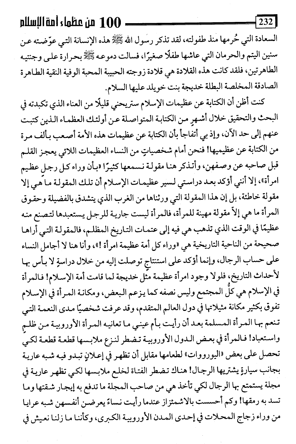 كنت أظن أن الكتابة عن عظيمات الإِسلام ستريحني قليلًا من العناء الذي تكبدته في البحث والتحقيق خلال أشهرٍ من الكتابة المتواصلة عن أولئك العظماء الذين كتبت عنهم إلى حد الآن، وإذ بي أتفاجأ بأن الكتابة عن عظيمات هذه الأمة أصعب بألف مرة من الكتابة عن عظيميها! فنحن أمام شخصياتٍ من النساء العظيمات اللائي يعجز القلم قبل صاحبه عن وصفهن، وأتذكر هنا مقولة نسمعها كثيرًا "بأن وراء كل رجلٍ عظيم امرأة"، إلا أنني أؤكد بعد دراستي لسير عظيمات الإِسلام أن تلك المقولة ما هي إلا مقولة خاطئة، بل إن هذه المقولة التي ورثناها من الغرب الذي يتشدق بالفضيلة وحقوق المرأة ما هي إلّا مقولة مهينة للمرأة، فالمرأة ليست جارية للرجل يستعبدها لتصنع منه عظيمًا في الوقت الذي تذهب هي فيه إلى عتمات التاريخ المظلم، فالمقولة التي أراها صحيحة من الناحية التاريخية هي "وراء كل أمة عظيمة امرأة! "، وأنا هنا لا أجامل النساء على حساب الرجال، وإنما أؤكد على استنتاجٍ توصلت إليه من خلال دراسةٍ لا بأس بها لأحداث التاريخ, فلولا وجود امرأة عظيمة مثل خديجة لما قامت أمة الإِسلام! فالمرأة في الإِسلام هي كل المجتمع وليس نصفه كما يزعم البعض، ومكانة المرأة في الإِسلام تفوق بكثير مكانة مثيلاتها في دول العالم المتقدم، وقد عرفت شخصيًا مدى النعمة التي تنعم بها المرأة المسلمة بعد أن رأيت بأم عيني ما تعانيه المرأة الأوروبية من ظلمٍ واستعباد! فالمرأة في بعض الدول الأوروبية تضطر لنزع ملابسها قطعة قطعة لكي تحصل على بعض "اليورووات" لطعامها مقابل أن تظهر في إعلانٍ تبدو فيه شبه عارية بجانب سيارةٍ يشتريها الرجال! هناك تضطر الفتاة لخلع ملابسها لكي تظهر عارية في مجلة يستمتع بها الرجال لكي تأخذ هي من صاحب المجلة ما تدفع به إيجار شقتها وما تسد به رمقها! وكم أحسست بالاشمئزاز عندما رأيت نساءً يعرضن أنفسهن شبه عرايا من وراء زجاج المحلات في إحدى المدن الأوروبية "الكبرى" وكأننا ما زلنا نعيش في