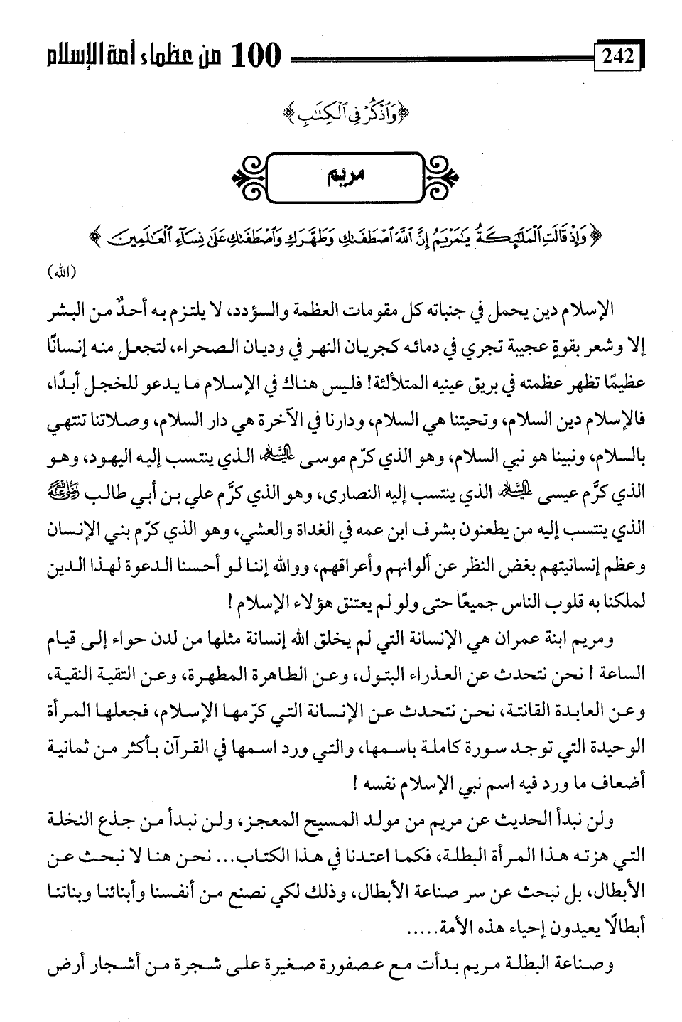 ومريم ابنة عمران هي الإنسانة التي لم يخلق اللَّه إنسانة مثلها من لدن حواء إلى قيام الساعة! نحن نتحدث عن العذراء البتول، وعن الطاهرة المطهرة، وعن التقية النقية، وعن العابدة القانتة، نحن نتحدث عن الإنسانة التي كرّمها الإِسلام، فجعلها المرأة الوحيدة التي توجد سورة كاملة باسمها، والتي ورد اسمها في القرآن بأكثر من ثمانية أضعاف ما ورد فيه اسم نبي الإِسلام نفسه!