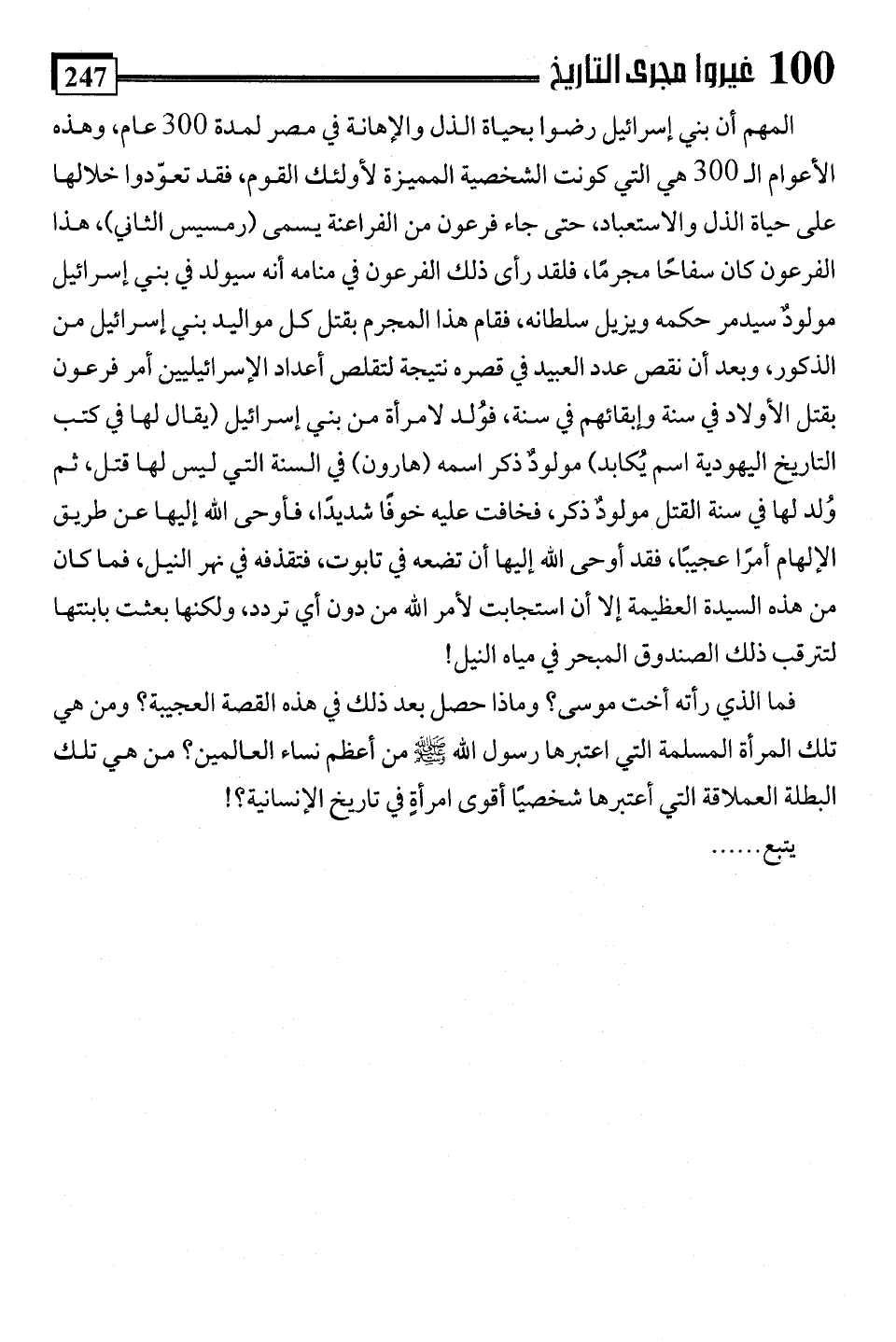 فما الذي رأته أخت موسى؟ وماذا حصل بعد ذلك في هذه القصة العجيبة؟ ومن هي تلك المرأة المسلمة التي اعتبرها رسول اللَّه -صلى اللَّه عليه وسلم- من أعظم نساء العالمين؟ من هي تلك البطلة العملاقة التي أعتبرها شخصيًا أقوى امرأةٍ في تاريخ الإنسانية؟!
