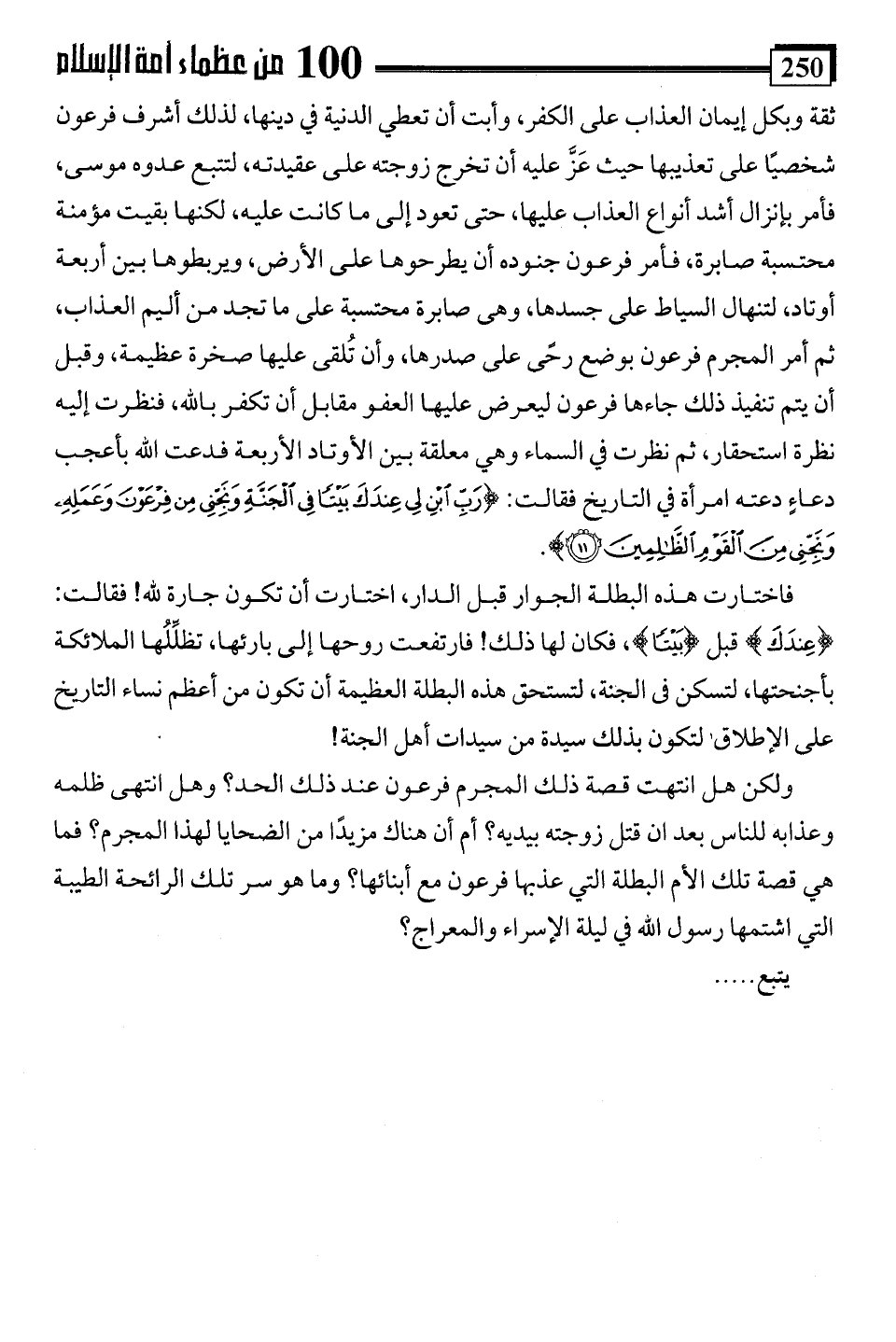 ولكن هل انتهت قصة ذلك المجرم فرعون عند ذلك الحد؟ وهل انتهى ظلمه وعذابه للناس بعد أن قتل زوجته بيديه؟ أم أن هناك مزيدًا من الضحايا لهذا المجرم؟ فما هي قصة تلك الأم البطلة التي عذبها فرعون مع أبنائها؟ وما هو سر تلك الرائحة الطيبة التي اشتمها رسول اللَّه في ليلة الإسراء والمعراج؟