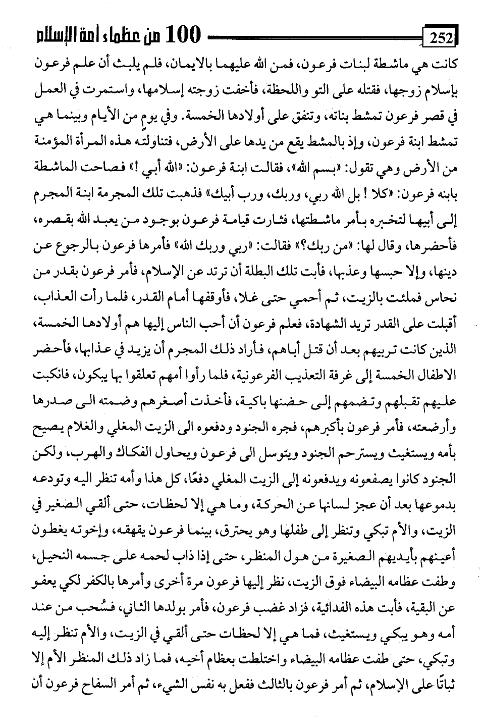 كانت هي ماشطة لبنات فرعون، فمن اللَّه عليهما بالايمان، فلم يلبث أن علم فرعون بإسلام زوجها، فقتله على التو واللحظة، فأخفت زوجته إسلامها، واستمرت في العمل في قصر فرعون تمشط بناته، وتنفق على أولادها الخمسة. وفي يومٍ من الأيام وبينما هي تمشط ابنة فرعون، وإذ بالمشط يقع من يدها على الأرض، فتناولته هذه المرأة المؤمنة من الأرض وهي تقول: "بسم اللَّه"، فقالت ابنة فرعون: "اللَّه أبي! " فصاحت الماشطة بابنه فرعون: "كلا! بل اللَّه ربي، وربك، ورب أبيك" فذهبت تلك المجرمة ابنة المجرم إلى أبيها لتخبره بأمر ماشطتها، فثارت قيامة فرعون بوجود من يعبد اللَّه بقصره، فأحضرها، وقال لها: "من ربك؟ " فقالت: "ربي وربك اللَّه" فأمرها فرعون بالرجوع عن دينها، وإلا حبسها وعذبها، فأبت تلك البطلة أن ترتد عن الإسلام، فأمر فرعون بقدر من نحاس فملئت بالزيت، ثم أحمي حتى غلا، فأوقفها أمام القدر، فلما رأت العذاب، أقبلت على القدر تريد الشهادة، فعلم فرعون أن أحب الناس إليها هم أولادها الخمسة، الذين كانت تربيهم بعد أن قتل أباهم، فأراد ذلك المجرم أن يزيد في عذابها، فأحضر الأطفال الخمسة إلى غرفة التعذيب الفرعونية، فلما رأوا أمهم تعلقوا بها يبكون، فانكبت عليهم تقبلهم وتضمهم إلى حضنها باكية، فأخذت أصغرهم وضمته التي صدرها وأرضعته، فأمر فرعون بأكبرهم، فجره الجنود ودفعوه التي الزيت المغلي والغلام يصيح بأمه ويستغيث ويسترحم الجنود ويتوسل الى فرعون ويحاول الفكاك والهرب، ولكن الجنود كانوا يصفعونه ويدفعونه إلى الزيت المغلي دفعًا، كل هذا وأمه تنظر اليه وتودعه بدموعها بعد أن عجز لسانها عن الحركة، وما هي إلا لحظات، حتى ألقي الصغير في الزيت، والأم تبكي وتنظر إلى طفلها وهو يحترق، بينما فرعون يقهقه، وإخوته يغطون أعينهم بأيديهم الصغيرة من هول المنظر، حتى إذا ذاب لحمه على جسمه النحيل، وطفت عظامه البيضاء فوق الزيت، نظر إليها فرعون مرة أخرى وأمرها بالكفر لكي يعفو عن البقية، فأبت هذه الفدائية، فزاد غضب فرعون، فأمر بولدها الثاني، فسُحب من عند أمه وهو يبكي ويستغيث، فما هي إلا لحظات حتى ألقي في الزيت، والأم تنظر إليه وتبكي، حتى طفت عظامه البيضاء واختلطت بعظام أخيه، فما زاد ذلك المنظر الأم إلا ثباتًا على الإسلام، ثم أمر فرعون بالثالث ففعل به نفس الشيء، ثم أمر السفاح فرعون أن