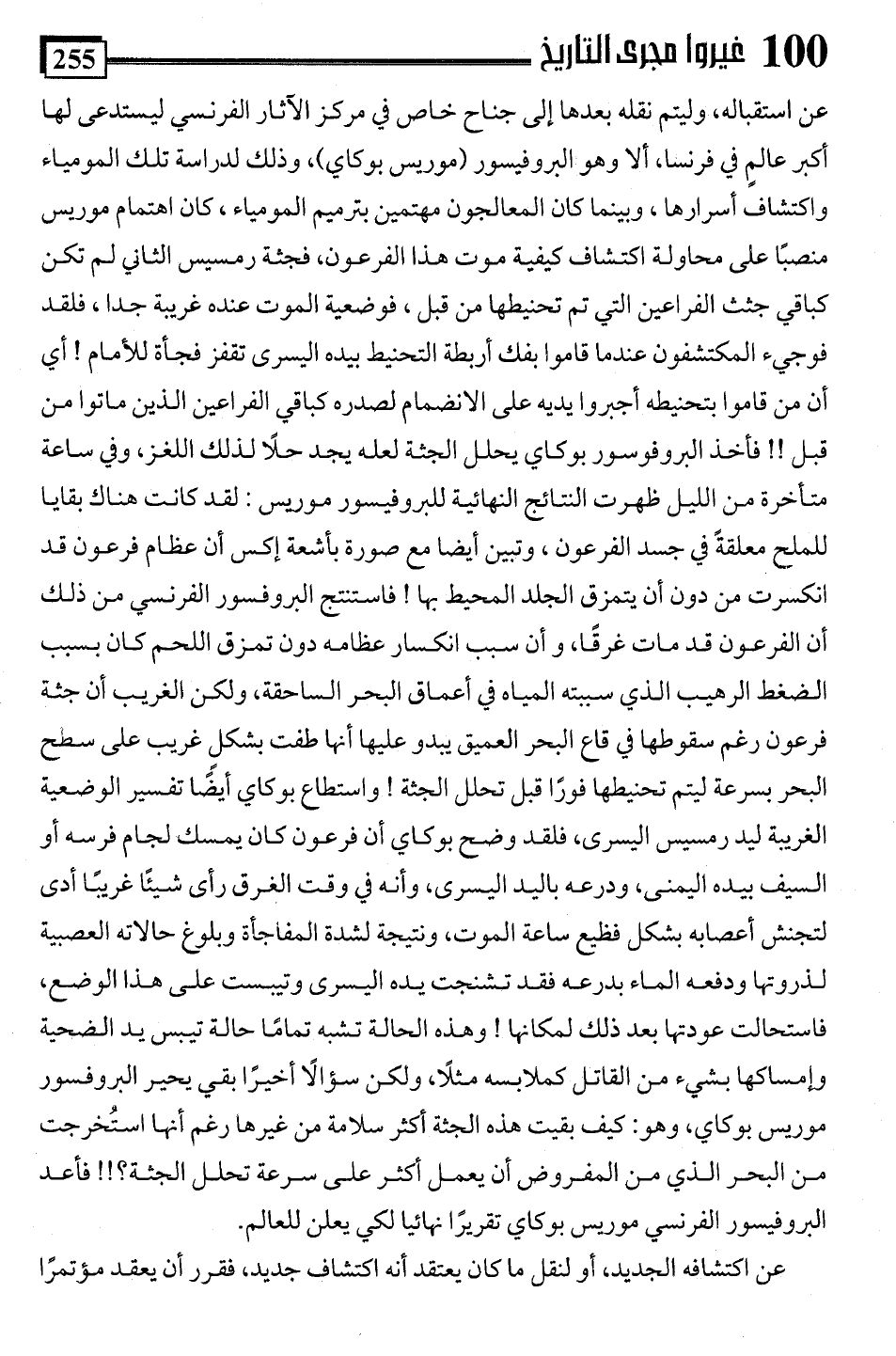 عن استقباله، وليتم نقله بعدها إلى جناح خاص في مركز الآثار الفرنسي ليستدعى لها أكبر عالمٍ في فرنسا، ألا وهو البروفيسور (موريس بوكاي)، وذلك لدراسة تلك المومياء واكتشاف أسرارها، وبينما كان المعالجون مهتمين بترميم المومياء، كان اهتمام موريس منصبًا على محاولة اكتشاف كيفية موت هذا الفرعون، فجثة رمسيس الثاني لم تكن كباقي جثث الفراعين التي تم تحنيطها من قبل، فوضعية الموت عنده غريبة جدا، فلقد فوجيء المكتشفون عندما قاموا بفك أربطة التحنيط بيده اليسرى تقفز فجأة للأمام! أي أن من قاموا بتحنيطه أجبروا يديه على الانضمام لصدره كباقي الفراعين الذين ماتوا من قبل!! فأخذ البروفوسور بوكاي يحلل الجثة لعله يجد حلًا لذلك اللغز، وفي ساعة متأخرة من الليل ظهرت النتائج النهائية للبروفيسور موريس: لقد كانت هناك بقايا للملح معلقةً في جسد الفرعون، وتبين أيضا مع صورة بأشعة إكس أن عظام فرعون قد انكسرت من دون أن يتمزق الجلد المحيط بها! فاستنتج البروفسور الفرنسي من ذلك أن الفرعون قد مات غرقًا، وأن سبب انكسار عظامه دون تمزق اللحم كان بسبب الضغط الرهيب الذي سببته المياه في أعماق البحر الساحقة، ولكن الغريب أن جثة فرعون رغم سقوطها في قاع البحر العميق يبدو عليها أنها طفت بشكل غريب على سطح البحر بسرعة ليتم تحنيطها فورًا قبل تحلل الجثة! واستطاع بوكاي أيضًا تفسير الوضعية الغريبة ليد رمسيس اليسرى، فلقد وضح بوكاي أن فرعون كان يمسك لجام فرسه أو السيف بيده اليمنى، ودرعه باليد اليسرى، وأنه في وقت الغرق رأى شيئًا غريبًا أدى لتجنش أعصابه بشكل فظيع ساعة الموت، ونتيجة لشدة المفاجأة وبلوغ حالاته العصبية لذروتها ودفعه الماء بدرعه فقد تشنجت يده اليسرى وتيبست على هذا الوضع، فاستحالت عودتها بعد ذلك لمكانها! وهذه الحالة تشبه تمامًا حالة تيبس يد الضحية وإمساكها بشيء من القاتل كملابسه مثلًا، ولكن سؤالًا أخيرًا بقي يحير البروفسور موريس بوكاي، وهو: كيف بقيت هذه الجثة أكثر سلامة من غيرها رغم أنها استُخرجت من البحر الذي من المفروض أن يعمل أكثر على سرعة تحلل الجثة؟!! فأعد البروفيسور الفرنسي موريس بوكاي تقريرًا نهائيا لكي يعلن للعالم.