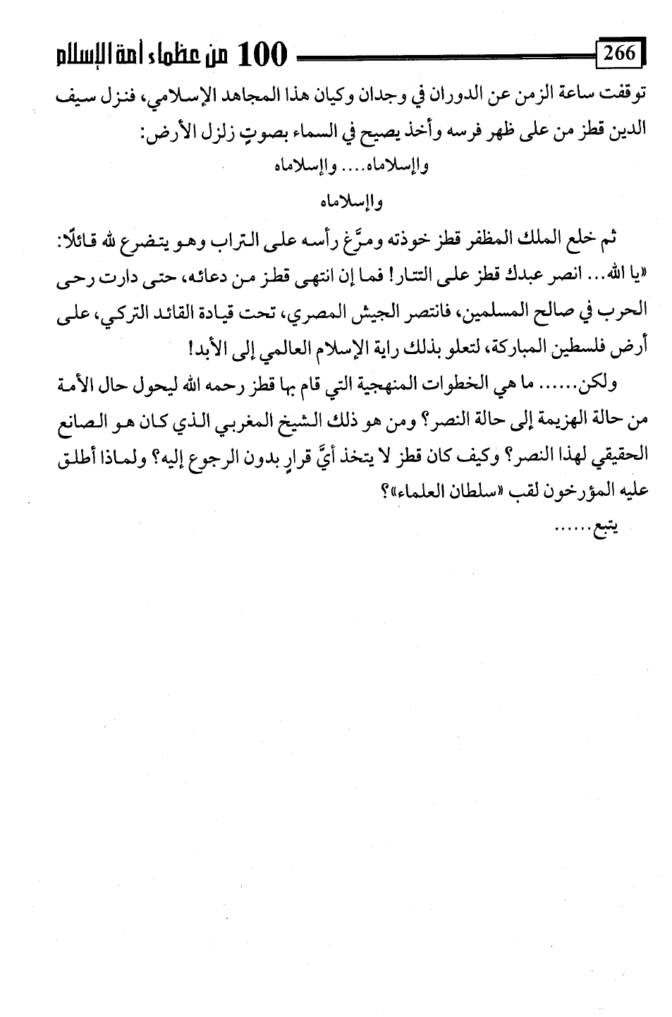ثم خلع الملك المظفر قطز خوذته ومرَّغ رأسه على التراب وهو يتضرع للَّه قائلًا: "يا اللَّه. . . انصر عبدك قطز على التتار! فما إن انتهى قطز من دعائه، حتى دارت رحى الحرب في صالح المسلمين، فانتصر الجيش المصري، تحت قيادة القائد التركي، على أرض فلسطين المباركة، لتعلو بذلك راية الإسلام العالمي إلى الأبد!
