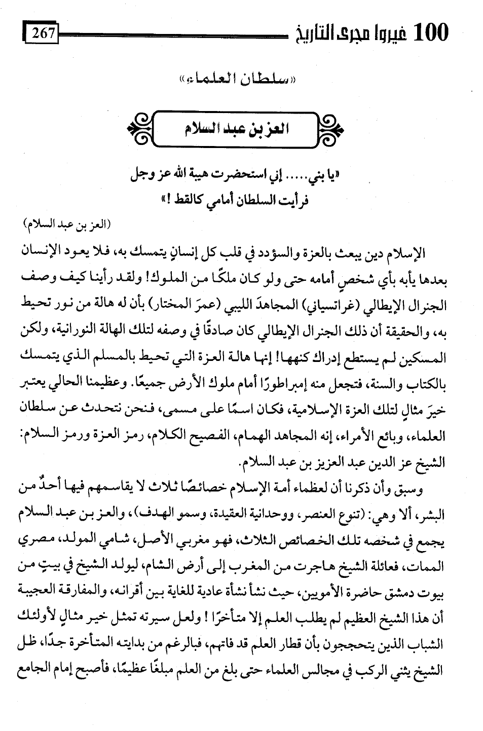 الإسلام دين يبعث بالعزة والسؤدد في قلب كل إنسانٍ يتمسك به، فلا يعود الإنسان بعدها يأبه بأي شخصٍ أمامه حتى ولو كان ملكًا من الملوك! ولقد رأينا كيف وصف الجنرال الإيطالي (غراتسياني) المجاهدَ الليبي (عمرَ المختار) بأن له هالة من نور تحيط به، والحقيقة أن ذلك الجنرال الإيطالي كان صادقا في وصفه لتلك الهالة النورانية، ولكن المسكين لم يستطع إدراك كنهها! إنها هالة العزة التي تحيط بالمسلم الذي يتمسك بالكتاب والسنة، فتجعل منه إمبراطورًا أمام ملوك الأرض جميعًا. وعظيمنا الحالي يعتبر خيرَ مثالٍ لتلك العزة الإسلامية، فكان اسمًا على مسمى، فنحن نتحدث عن سلطان العلماء، وبائع الأمراء، إنه المجاهد الهمام، الفصيح الكلام، رمز العزة ورمز السلام: الشيخ عز الدين عبد العزيز بن عبد السلام.