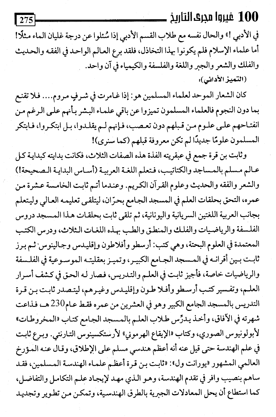 في الأدبي! " والحال نفسه مع طلاب القسم الأدبي إذا سُئلوا عن درجة غليان الماء مثلًا! أما علماء الإسلام فلم يكونوا بهذا التخاذل، فلقد برع العالم الواحد في الفقه والحديث والفلك والشعر والجبر واللغة والفلسفة والكيمياء في آن واحد.