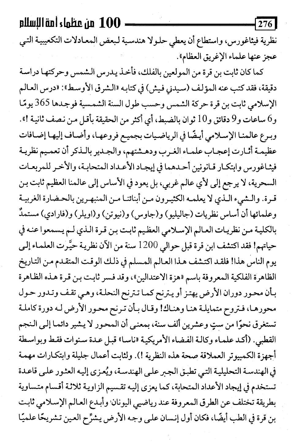 كما كان ثابت بن قرة من المولعين بالفلك، فأخذ يدرس الشمس وحركتها دراسة دقيقة، فقد كتب عنه المؤلف (سيدني فيش) في كتابه "الشرق الأوسط": "درس العالم الإسلامي ثابت بن قرة حركة الشمس وحسب طول السنة الشمسية فوجدها 365 يومًا و 6 ساعات و 9 دقائق و 10 ثوان بالضبط، أي أكثر من الحقيقة بأقل من نصف ثانية! ". وبرع عالمنا الإسلامي أيضًا في الرياضيات بجميع فروعها، وأضاف إليها إضافات عظيمة أثارت إعجاب علماء الغرب ودهشتهم، والجدير بالذكر أن تعميم نظرية فيثاغورس وابتكار قانونين أحدهما في إيجاد الأعداد المتحابة، والأخر للمربعات السحرية، لا يرجع إلى لأي عالم غربي، بل يعود في الأساس إلى عالمنا العظيم ثابت بن قرة. والشيء الذي لا يعلمه الكثيرون من أبنائنا من المنبهرين بالحضارة الغربية وعلمائها أن أساس نظريات (جاليليو) و (جاوس) و (نيوتن) و (اويلر) و (فارادي) مستمدٌ بالكلية من نظريات العالم الإسلامي العظيم ثابت بن قرة الذي لم يسمعوا عنه في حياتهم! فقد اكتشف ابن قرة قبل حوالي 1200 سنة من الآن نظرية حيَّرت العلماء إلى يوم الناس هذا! فلقد اكتشف هذا العالم المسلم في ذلك الوقت المتقدم من التاريخ الظاهرة الفلكية المعروفة باسم "هزة الاعتدالين"، وقد فسر ثابت بن قرة هذه الظاهرة بأن محور دوران الأرض يهتز أو يترنح كما تترنح النحلة، وهي تقف وتدور حول محورها، فتروح متمايلة هنا وهناك! وقال بأن ترنح محور الأرض له دورة كاملة تستغرق نحوًا من ستٍ وعشرين ألف سنة، بمعنى أن المحور لا يشير دائما إلى النجم القطبي. (أكد علماء وكالة الفضاء الأمريكية "ناسا" قبل عدة سنوات فقط وبواسطة أجهزة الكمبيوتر العملاقة صحة هذه النظرية!). ولثابت أعمال جليلة وابتكارات مهمة في الهندسة التحليلية التي تطبق الجبر على الهندسة، ويُعزى إليه العثور على قاعدة تستخدم في إيجاد الأعداد المتحابة، كما يعزى إليه تقسيم الزاوية ثلاثة أقسام متساوية بطريقة تختلف عن الطرق المعروفة عند رياضيي اليونان وأبدع العالم الإسلامي ثابت بن قرة في الطب أيضًا، فكان أول إنسان على وجه الأرض يشرِّح العين تشريحًا علميًا