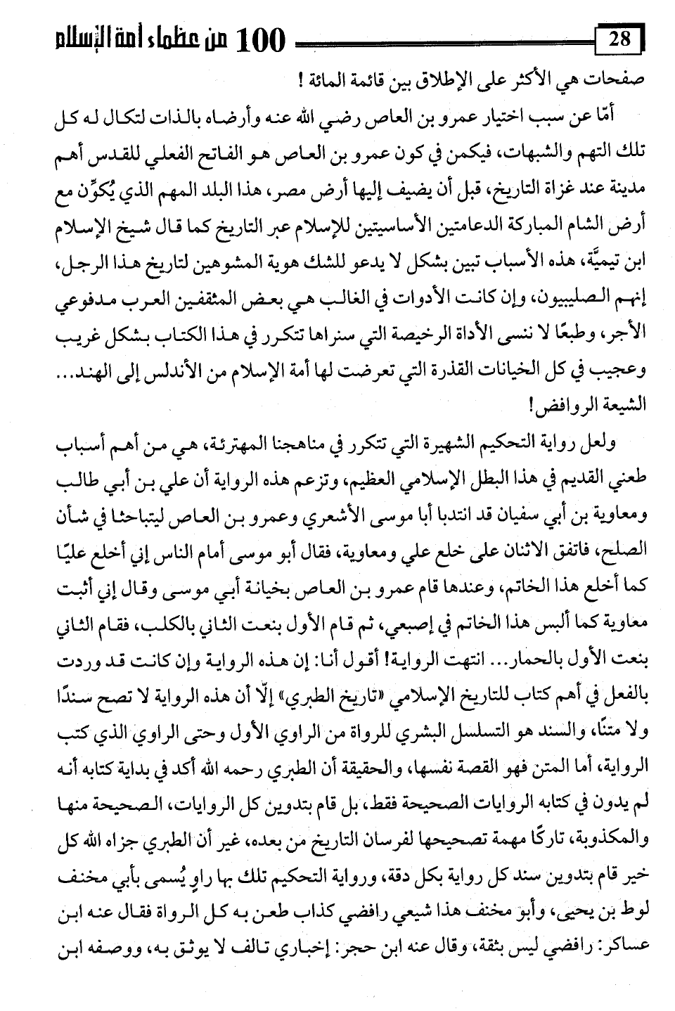 ولعل رواية التحكيم الشهيرة التي تتكرر في مناهجنا المهترئة، هي من أهم أسباب طعني القديم في هذا البطل الإسلامي العظيم، وتزعم هذه الرواية أن علي بن أبي طالب ومعاوية بن أبي سفيان قد انتدبا أبا موسى الأشعري وعمرو بن العاص ليتباحثا في شأن الصلح، فاتفق الاثنان على خلع علي ومعاوية، فقال أبو موسى أمام الناس إني أخلع عليًا كما أخلع هذا الخاتم، وعندها قام عمرو بن العاص بخيانة أبي موسى وقال إني أثبت معاوية كما ألبس هذا الخاتم في إصبعي، ثم قام الأول بنعت الثاني بالكلب، فقام الثاني بنعت الأول بالحمار. . . انتهت الرواية! أقول أنا: إن هذه الرواية وإن كانت قد وردت بالفعل في أهم كتاب للتاريخ الإسلامي "تاريخ الطبري" إلّا أن هذه الرواية لا تصح سندًا ولا متنًا، والسند هو التسلسل البشري للرواة من الراوي الأول وحتى الراوي الذي كتب الرواية، أما المتن فهو القصة نفسها، والحقيقة أن الطبري رحمه اللَّه أكد في بداية كتابه أنه لم يدون في كتابه الروايات الصحيحة فقط، بل قام بتدوين كل الروايات، الصحيحة منها والمكذوبة، تاركًا مهمة تصحيحها لفرسان التاريخ من بعده، غير أن الطبري جزاه اللَّه كل خير قام بتدوين سند كل رواية بكل دقة، ورواية التحكيم تلك بها راوٍ يُسمى بأبي مخنف لوط بن يحيى، وأبو مخنف هذا شيعي رافضي كذاب طعن به كل الرواة فقال عنه ابن عساكر: رافضي ليس بثقة، وقال عنه ابن حجر: إخباري تالف لا يوثق به، ووصفه ابن