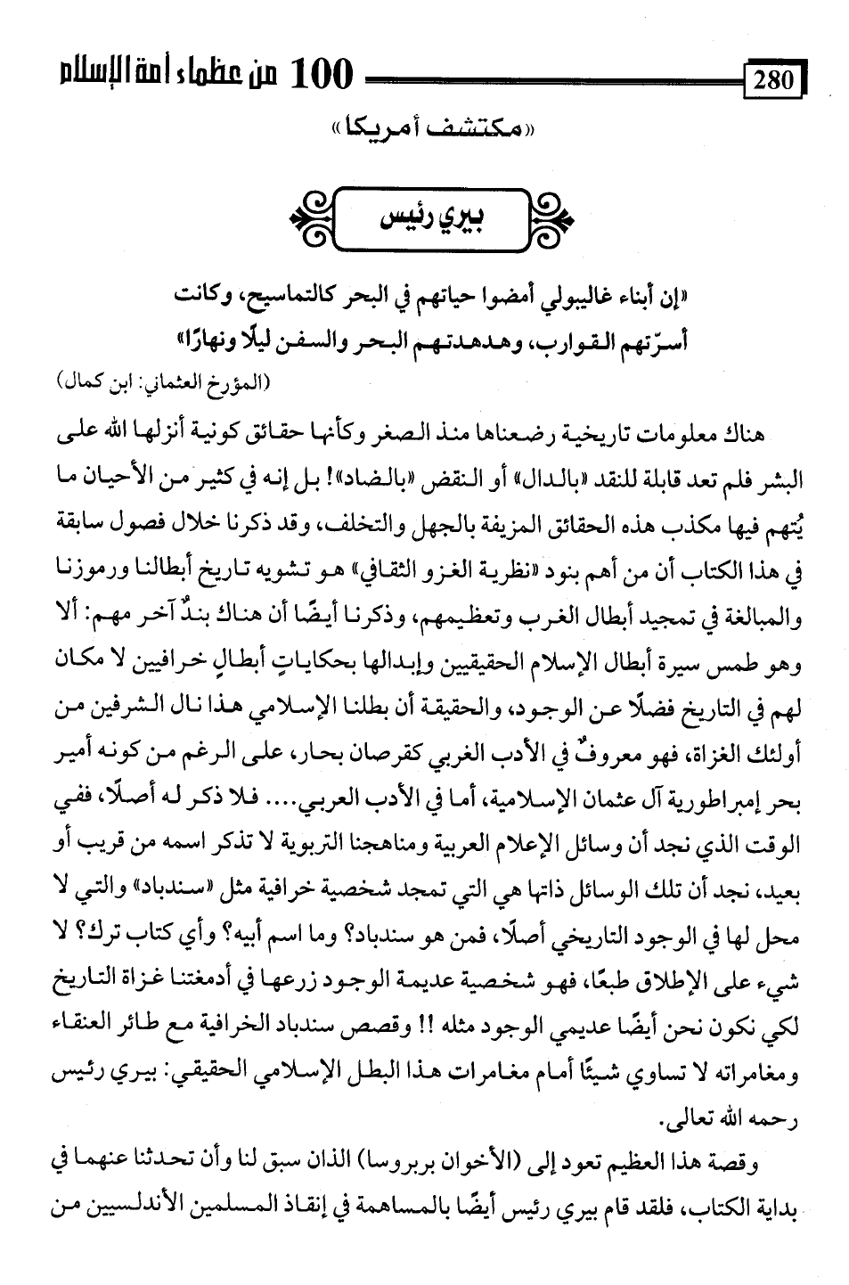 هناك معلومات تاريخية رضعناها منذ الصغر وكأنها حقائق كونية أنزلها اللَّه على البشر فلم تعد قابلة للنقد "بالدال" أو النقض "بالضاد"! بل إنه في كثير من الأحيان ما يُتهم فيها مكذب هذه الحقائق المزيفة بالجهل والتخلف، وقد ذكرنا خلال فصول سابقة في هذا الكتاب أن من أهم بنود "نظرية الغزو الثقافي" هو تشويه تاريخ أبطالنا ورموزنا والمبالغة في تمجيد أبطال الغرب وتعظيمهم، وذكرنا أيضًا أن هناك بندٌ آخر مهم: ألا وهو طمس سيرة أبطال الإسلام الحقيقيين وإبدالها بحكاياتٍ أبطالٍ خرافيين لا مكان لهم في التاريخ فضلًا عن الوجود، والحقيقة أن بطلنا الإسلامي هذا نال الشرفين من أولئك الغزاة، فهو معروفٌ في الأدب الغربي كقرصان بحار، على الرغم من كونه أمير بحر إمبراطورية آل عثمان الإسلامية، أما في الأدب العربي. . . . فلا ذكر له أصلًا، ففي الوقت الذي نجد أن وسائل الإعلام العربية ومناهجنا التربوية لا تذكر اسمه من قريب أو بعيد، نجد أن تلك الوسائل ذاتها هي التي تمجد شخصية خرافية مثل "سندباد" والتي لا محل لها في الوجود التاريخي أصلًا، فمن هو سندباد؟ وما اسم أبيه؟ وأي كتاب ترك؟ لا شيء على الإطلاق طبعًا، فهو شخصية عديمة الوجود زرعها في أدمغتنا غزاة التاريخ لكي نكون نحن أيضًا عديمي الوجود مثله!! وقصص سندباد الخرافية مع طائر العنقاء ومغامراته لا تساوي شيئًا أمام مغامرات هذا البطل الإسلامي الحقيقي: بيري رئيس رحمه اللَّه تعالى.