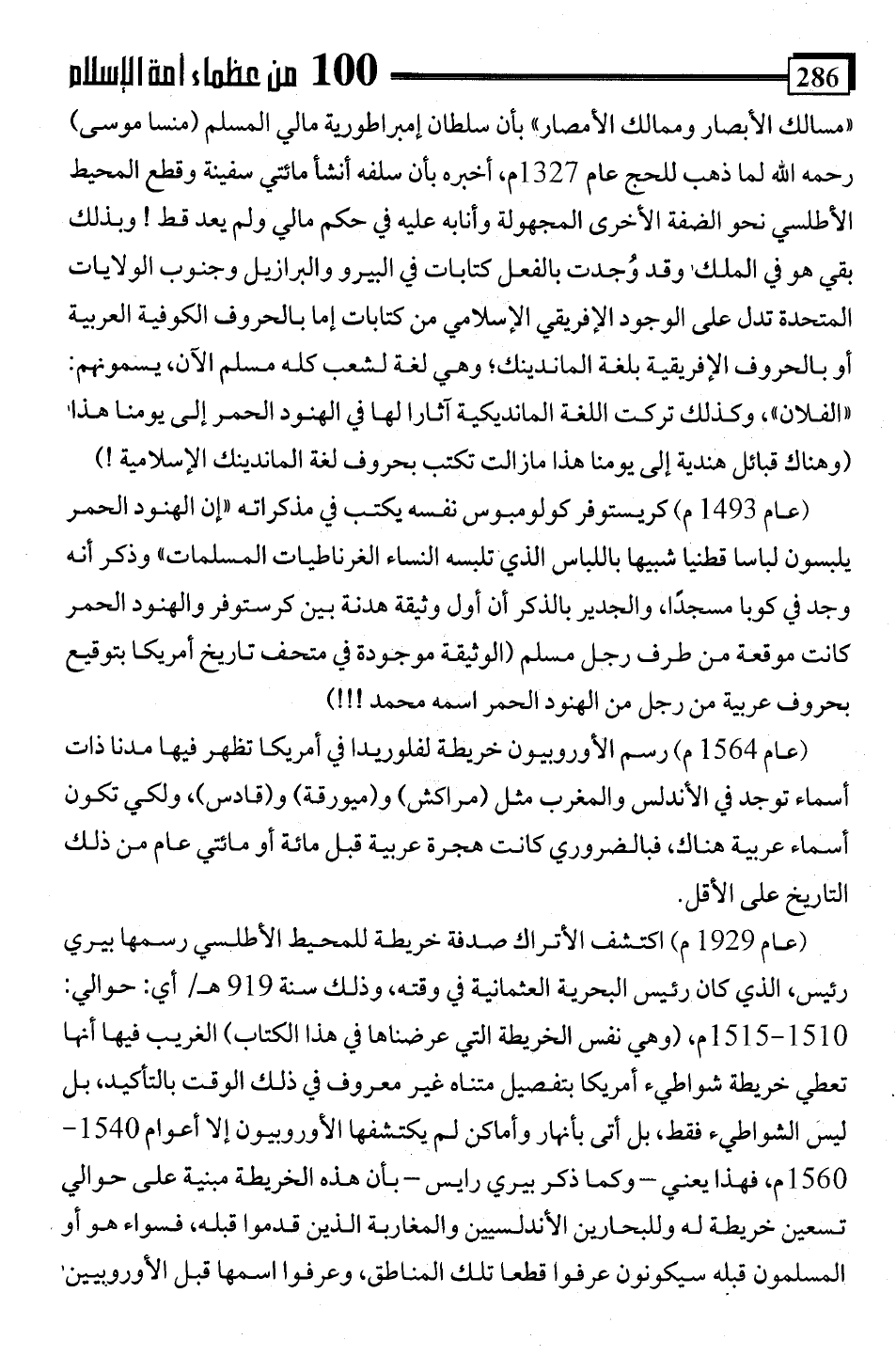 "مسالك الأبصار وممالك الأمصار" بأن سلطان إمبراطورية مالي المسلم (منسا موسى) رحمه اللَّه لما ذهب للحج عام 1327 م، أخبره بأن سلفه أنشأ مائتي سفينة وقطع المحيط الأطلسي نحو الضفة الأخرى المجهولة وأنابه عليه في حكم مالي ولم يعد قط! وبذلك بقي هو في الملك وقد وُجدت بالفعل كتابات في البيرو والبرازيل وجنوب الولايات المتحدة تدل على الوجود الإفريقي الإسلامي من كتابات إما بالحروف الكوفية العربية أو بالحروف الإفريقية بلغة الماندينك؛ وهي لغة لشعب كله مسلم الآن، يسمونهم: "الفلان"، وكذلك تركت اللغة المانديكية آثارا لها في الهنود الحمر إلى يومنا هذا (وهناك قبائل هندية إلى يومنا هذا ما زالت تكتب بحروف لغة الماندينك الإسلامية!)