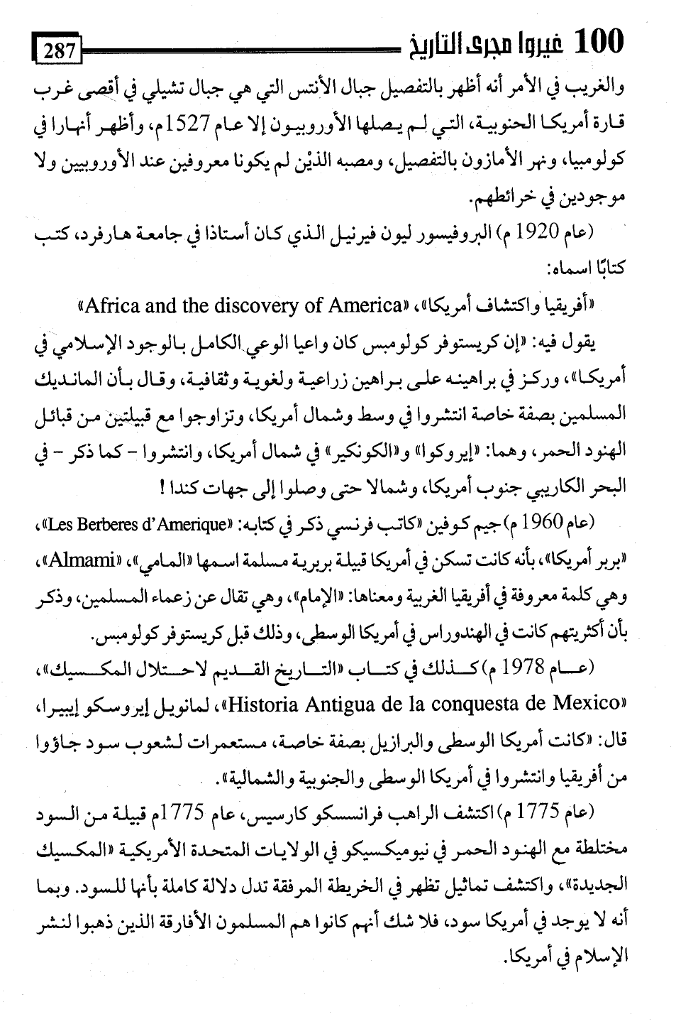 يقول فيه: "إن كريستوفر كولومبس كان واعيا الوعي الكامل بالوجود الإسلامي في أمريكا"، وركز في براهينه على براهين زراعية ولغوية وثقافية، وقال بأن المانديك المسلمين بصفة خاصة انتشروا في وسط وشمال أمريكا، وتزاوجوا مع قبيلتين من قبائل الهنود الحمر، وهما: "إيروكوا" و"الكونكير" في شمال أمريكا، وانتشروا -كما ذكر- في البحر الكاريبي جنوب أمريكا، وشمالا حتى وصلوا إلى جهات كندا!