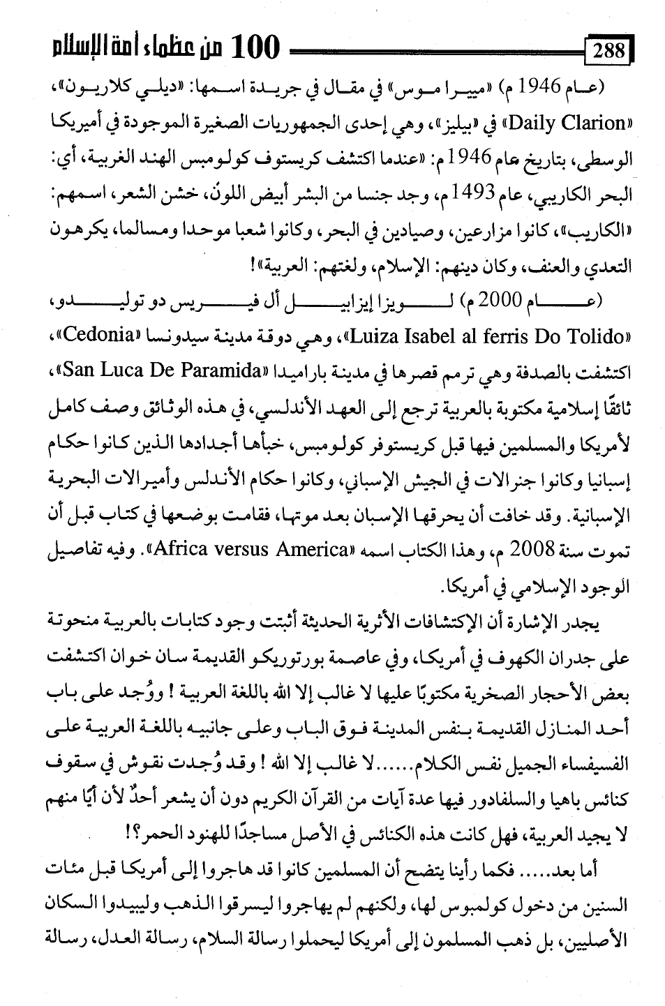 أما بعد. . . . فكما رأينا يتضح أن المسلمين كانوا قد هاجروا إلى أمريكا قبل مئات السنين من دخول كولمبوس لها، ولكنهم لم يهاجروا ليسرقوا الذهب وليبيدوا السكان الأصليين، بل ذهب المسلمون إلى أمريكا ليحملوا رسالة السلام، رسالة العدل، رسالة