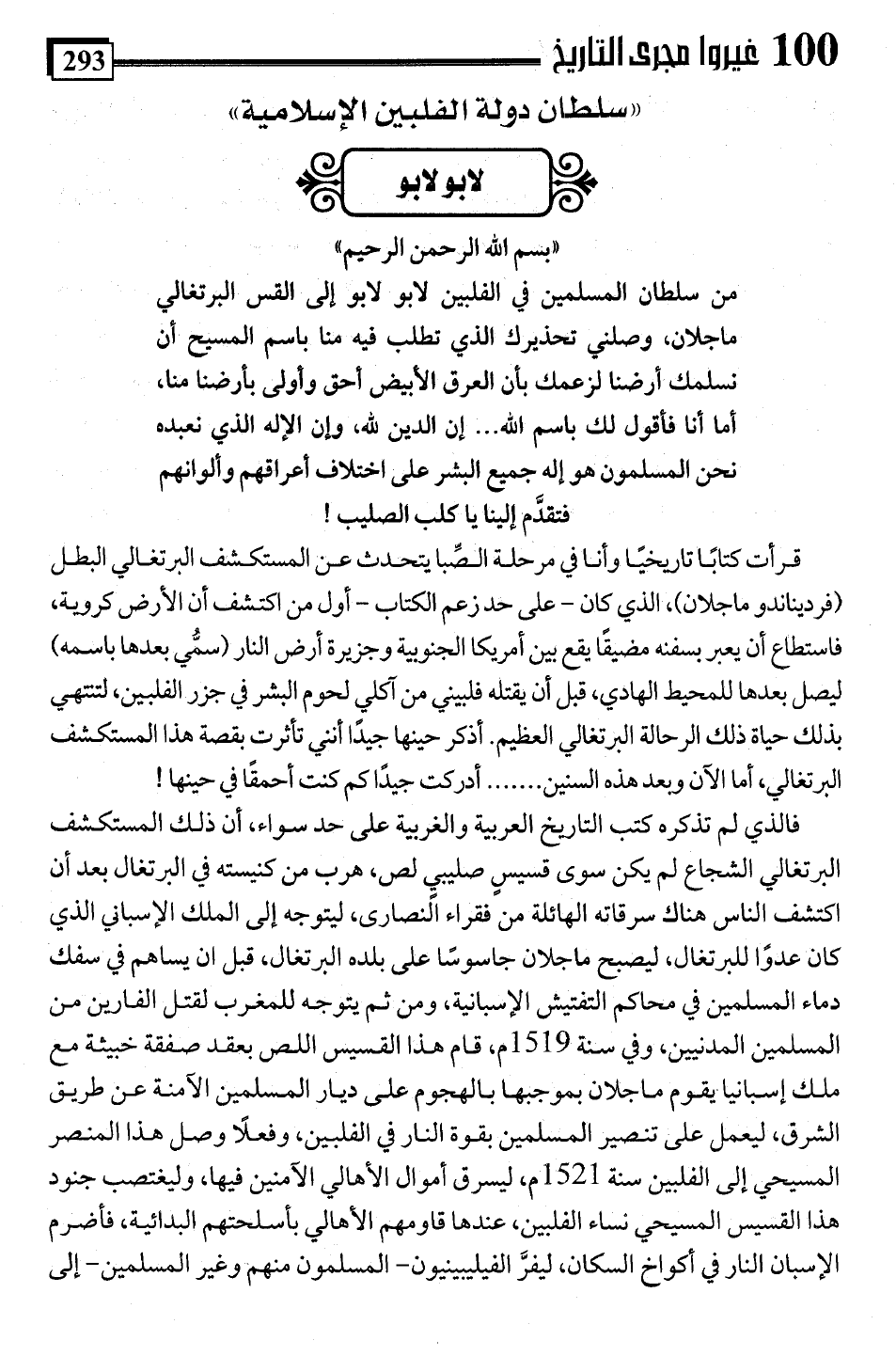 من سلطان المسلمين في الفلبين لابو لابو إلى القس البرتغالي ماجلان، وصلني تحذيرك الذي تطلب فيه منا باسم المسيح أن نسلمك أرضنا لزعمك بأن العرق الأبيض أحق وأولى بأرضنا منا، أما أنا فأقول لك باسم اللَّه. . . إن الدين للَّه، وإن الإله الذي نعبده نحن المسلمون هو إله جميع البشر على اختلاف أعراقهم وألوانهم فتقدَّم إلينا يا كلب الصليب!