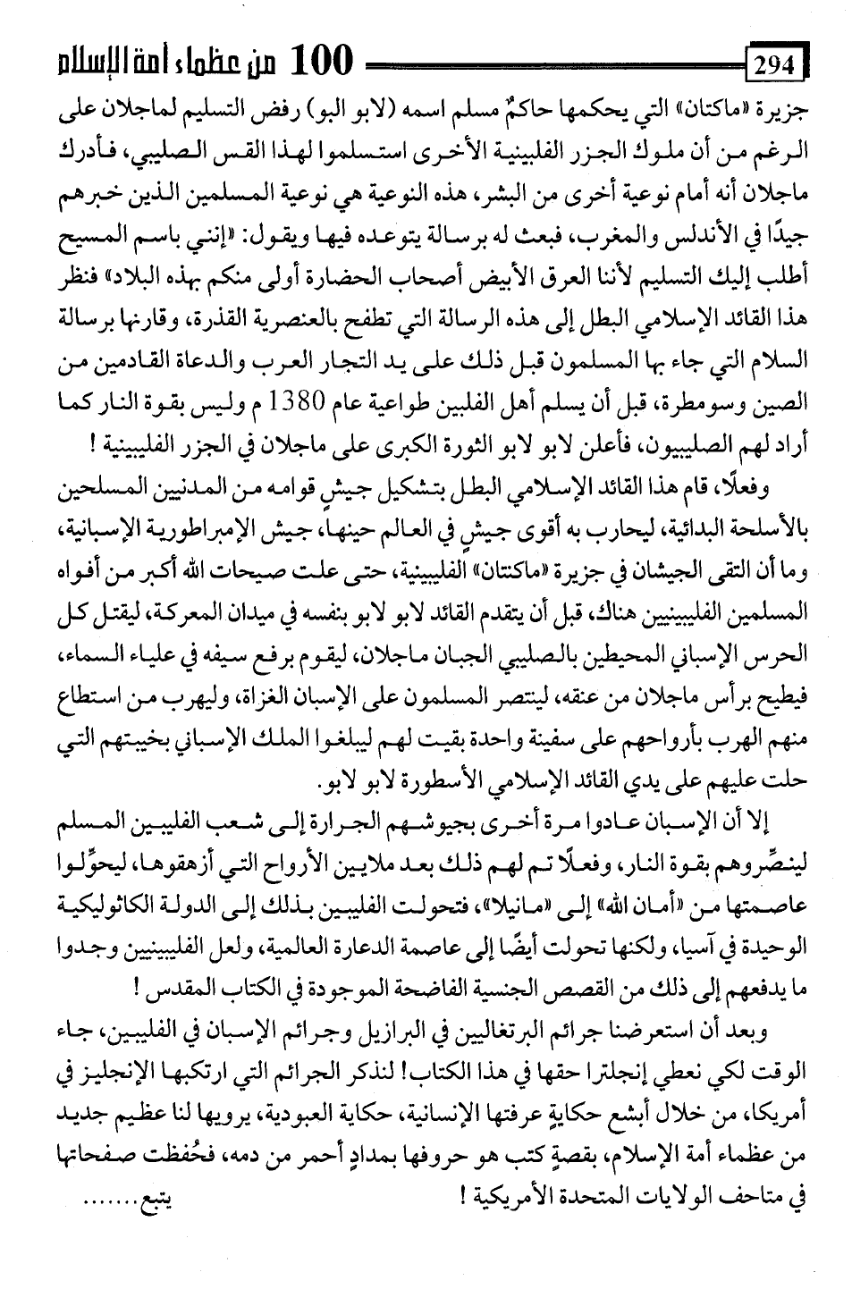 جزيرة "ماكتان" التي يحكمها حاكمٌ مسلم اسمه (لابو لابو) رفض التسليم لماجلان على الرغم من أن ملوك الجزر الفلبينية الأخرى استسلموا لهذا القس الصليبي، فأدرك ماجلان أنه أمام نوعية أخرى من البشر، هذه النوعية هي نوعية المسلمين الذين خبرهم جيدًا في الأندلس والمغرب، فبعث له برسالة يتوعده فيها ويقول: "إنني باسم المسيح أطلب إليك التسليم لأننا العرق الأبيض أصحاب الحضارة أولى منكم بهذه البلاد، فنظر هذا القائد الإسلامي البطل إلى هذه الرسالة التي تطفح بالعنصرية القذرة، وقارنها برسالة السلام التي جاء بها المسلمون قبل ذلك على يد التجار العرب والدعاة القادمين من الصين وسومطرة، قبل أن يسلم أهل الفلبين طواعية عام 1380 م وليس بقوة النار كما أراد لهم الصليبيون، فأعلن لابو لابو الثورة الكبرى على ماجلان في الجزر الفليبينية!