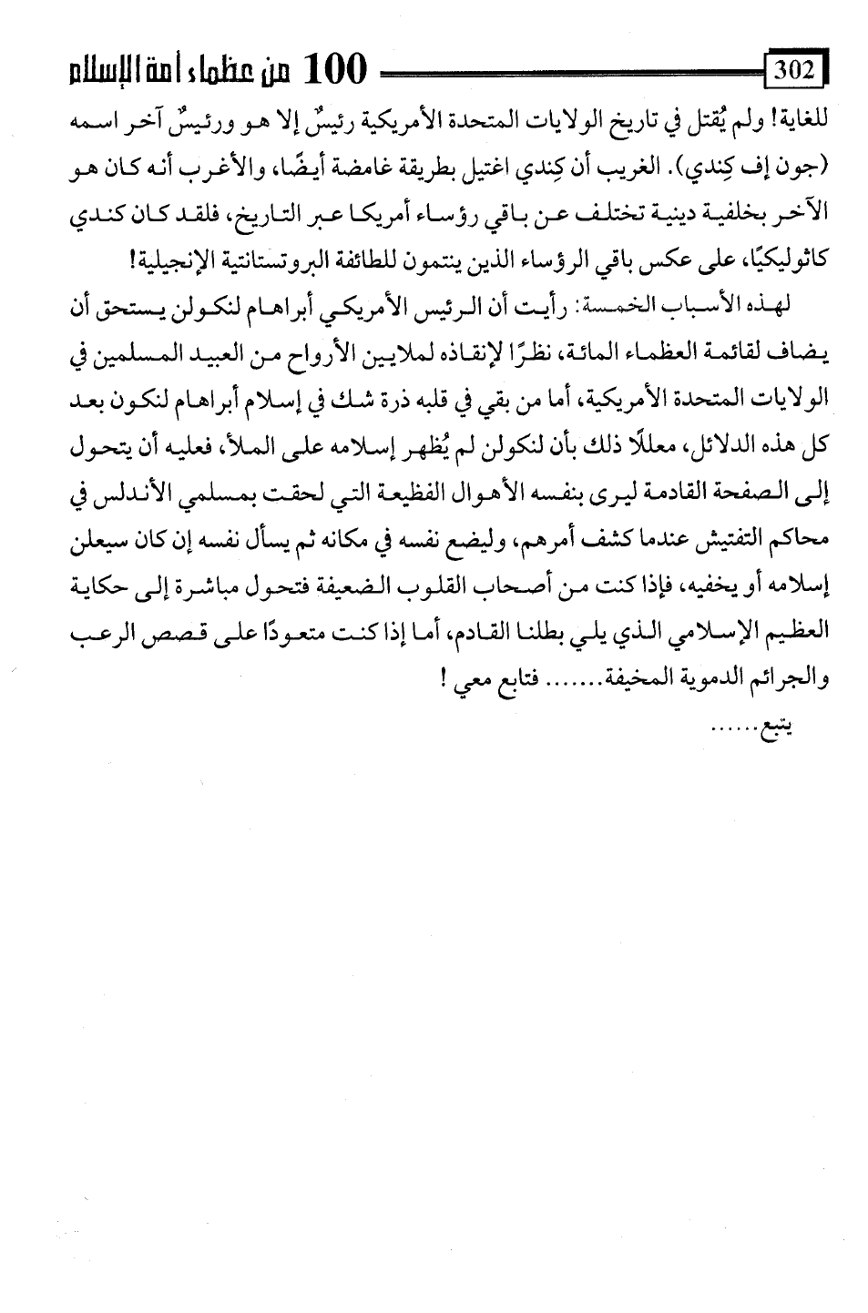 لهذه الأسباب الخمسة: رأيت أن الرئيس الأمريكي أبراهام لنكولن يستحق أن يضاف لقائمة العظماء المائة، نظرًا لإنقاذه لملايين الأرواح من العبيد المسلمين في الولايات المتحدة الأمريكية، أما من بقي في قلبه ذرة شك في إسلام أبراهام لنكولن بعد كل هذه "الدلائل" معللًا ذلك بأن لنكولن لم يُظهر إسلامه على الملأ، فعليه أن يتحول إلى الصفحة القادمة ليرى بنفسه الأهوال الفظيعة التي لحقت بمسلمي الأندلس في محاكم التفتيش عندما كشف أمرهم، وليضع نفسه في مكانه ثم يسأل نفسه إن كان سيعلن إسلامه أو يخفيه، فإذا كنت من أصحاب القلوب الضعيفة فتحول مباشرة إلى حكاية العظيم الإِسلامي الذي يلي بطلنا القادم، أما إذا كنت متعودًا على قصص الرعب والجرائم الدموية المخيفة. . . . . . فتابع معي!
