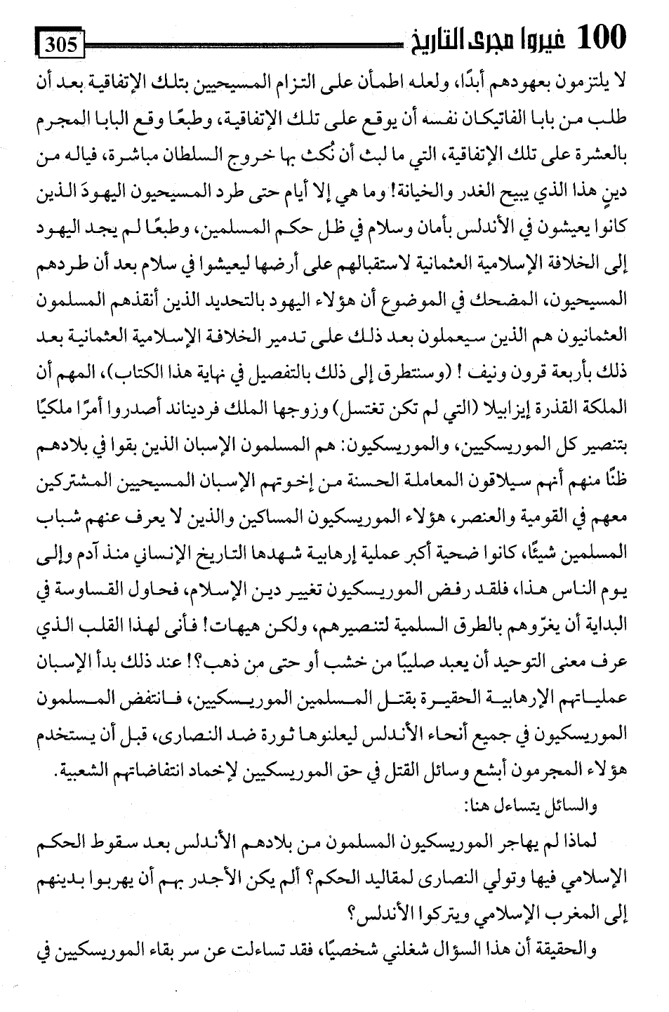 لا يلتزمون بعهودهم أبدًا, ولعله اطمأن على التزام المسيحيين بتلك الإتفاقية بعد أن طلب من بابا الفاتيكان نفسه أن يوقع على تلك الإتفاقية، وطبعًا وقع البابا المجرم بالعشرة على تلك الإتفاقية، التي ما لبث أن نكث بها خروج السلطان مباشرة، فياله من دينٍ هذا الذي يحيى الغدر والخيانة! وما هي إلا أيام حتى طرد المسيحيون اليهودَ الذين كانوا يعيشون في الأندلس بأمان وسلام في ظل حكم المسلمين، وطبعًا لم يجد اليهود إلا الخلافة الإِسلامية العثمانية لاستقبالهم على أرضها ليعيشوا في سلام بعد أن طردهم المسيحيون، المضحك في الموضوع أن هؤلاء اليهود بالتحديد الذين أنقذهم المسلمون العثمانيون هم الذين سيعملون بعد ذلك على تدمير الخلافة الإِسلامية العثمانية بعد ذلك بأربعة قرون ونيف! (وسنتطرق إلى ذلك بالتفصيل في نهاية هذا الكتاب)، المهم أن الملكة القذرة إيزابيلا (التي لم تكن تغتسل) وزوجها الملك فرديناند أصدروا أمرًا ملكيًا بتنصير كل الموريسكيين، والموريسكيون: هم المسلمون الإسبان الذين بقوا في بلادهم ظنًا منهم أنهم سيلاقون المعاملة الحسنة من إخوتهم الإسبان المسيحيين المشتركين معهم في القومية والعنصر، هؤلاء الموريسكيون المساكين والذين لا يعرف عنهم شباب المسلمين شيئًا، كانوا ضحية أكبر عملية إرهابية شهدها التاريخ الإنساني منذ آدم وإلى يوم الناس هذا، فلقد رفض الموريسكيون تغيير دين الإِسلام، فحاول القساوسة في البداية أن يغرّوهم بالطرق السلمية لتنصيرهم، ولكن هيهات! فأنى لهذا القلب الذي عرف معنى التوحيد أن يعبد صليبًا من خشب أو حتى من ذهب؟! عند ذلك بدأ الإسبان عملياتهم الإرهابية الحقيرة بقتل المسلمين الموريسكيين، فانتفض المسلمون الموريسكيون في جميع أنحاء الأندلس ليعلنوها ثورة ضد النصارى، قبل أن يستخدم هؤلاء المجرمون أبشع وسائل القتل في حق الموريسكيين لإخماد انتفاضاتهم الشعبية.