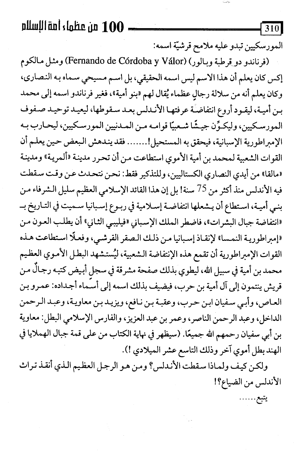 (فرناندو دو قرطبة وبالور) (Fernand de cordoba y Valor) ومثل مالكوم إكس كان يعلم أن هذا الاسم ليس اسمه الحقيقي، بل اسم مسيحي سماه به النصارى، وكان يعلم أنه من سلالة رجالٍ عظماء يُقال لهم "بنو أمية"، فغير فرناندو اسمه إلى محمَّد بن أمية، ليقود أروع انتفاضة عرفتها الأندلس بعد سقوطها, ليعيد توحيد صفوف المورسكيين، وليكوِّن جيشا شعبيًا قوامه من المدنيين المورسكيين، ليحارب به الإمبراطورية الإسبانية، فيحقق به المستحيل!. . . . . فقد يندهش البعض حين يعلم أن القوات الشعبية لمحمد بن أمية الأموي استطاعت من أن تحرر مدينة "ألمرية" ومدينة "مالقا" من أيدي النصاري الكستاليين، وللتذكير فقط: نحن نتحدث عن وقت سقطت فيه الأندلس منذ أكثر من 75 سنة! بل إن هذا القائد الإِسلامي العظيم سليل الشرفاء من بني أمية، استطاع أن يشعلها انتفاضة إسلامية في ربوع إسبانيا سميت في التاريخ بـ "انتفاضة جبال البشرات"، فاضطر الملك الإسباني "فيليبي الثاني" أن يطلب العون من "إمبراطورية النمسا" لإنقاذ إسبانيا من ذلك الصقر القرشي، وفعلًا استطاعت هذه القوات الإمبراطورية أن تقمع هذه الإنتفاضة الشعبية، ليُستشهد البطل الأموي العظيم محمَّد بن أمية في سبيل اللَّه، ليطوي بذلك صفحة مشوقة في سجل أبيض كتبه رجالٌ من قريش ينتمون إلى آل أمية بن حرب، فيضيف بذلك اسمه إلى أسماء أجداده: عمرو بن العاص، وأبي سفيان ابن حرب، وعقبة بن نافع، ويزيد بن معاوية، وعبد الرحمن الداخل، وعبد الرحمن الناصر، وعمر بن عبد العزيز، والفارس الإِسلامي البطل: معاوية بن أبي سفيان رحمهم اللَّه جميعًا. (سيظهر في نهاية الكتاب من على قمة جبال الهملايا في الهند بطل أموي آخر وذلك التاسع عشر الميلادي!).