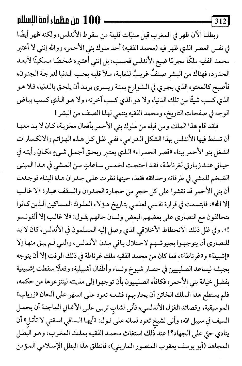 فلقد قام هذا الملك ومن قبله من ملوك بني الأحمر بأفعال مخزية، كان لا بد معها أن تسقط فيها الأندلس بهذا الشكل الدرامي، ففي ظل كل هذه الهزائم والانكسارات انشغل بنو الأحمر ببناء "قصر الحمراء" الذي يعتبر وبحق أجمل شيءٍ مكانٍ رأيته في حياتي عند زيارتي لغرناطة، فقد احتجت لخمس ساعاتٍ من المشي في هذا المبنى الضخم للمشي في طرقاته وحدائقه فقط، حينها نظرت على جدران هذا البناء فوجدت أن بني الأحمر قد نقشوا على كل حجرٍ من حجارة الجدران والسقف عبارة "لا غالب إلا اللَّه"، فابتسمت في قرارة نفسي لعلمي بتاريخ هؤلاء الملوك المساكين الذين كانوا يتحالفون مع النصارى على بعضهم البعض ولسان حالهم يقول: "لا غالب إلا ألفونسو! ". وفي ظل ذلك الانحطاط الأخلاقي الذي وصل إليه المسلمون في الأندلس، كان لا بد للنصارى أن يتوجهوا بجيوشهم لاحتلال باقي مدن الأندلس، والتي لم يبق منها إلا "إشبيلة" و"غرناطة"، فما كان من محمد الفقيه ملك غرناطة في ذلك الوقت إلا أن يتوجه بجيشه ليساعد الصليبيين في حصار شيوخ ونساء وأطفال أشبيلية، وفعلًا سقطت إشبيلية بفضل خيانة بني الأحمر، فكافأه الصليبيون بأن توجهوا إلى مدينته لينتزعوها من حكمه، فلم يستطع هذا الملك الخائن أن يحاربهم، فشعبه تعود على السهر على ألحان "زرياب" الموسيقية، وقصائد الغزل الأندلسي، فأنى لشابٍ تربى على الأغاني الماجنة أن يحمل السيف في سبيل اللَّه، وأنى لشيخٍ تعود لسانه على قول: "أيها الساقي اسقني لا تأتلِ" أن ينادي حيَّ على الجهاد؟! عند ذلك استغاث محمد الفقيه بملك المغرب، وهو البطل المجاهد (أبو يوسف يعقوب المنصور الماريني)، فانطلق هذا البطل الإِسلامي المؤمن
