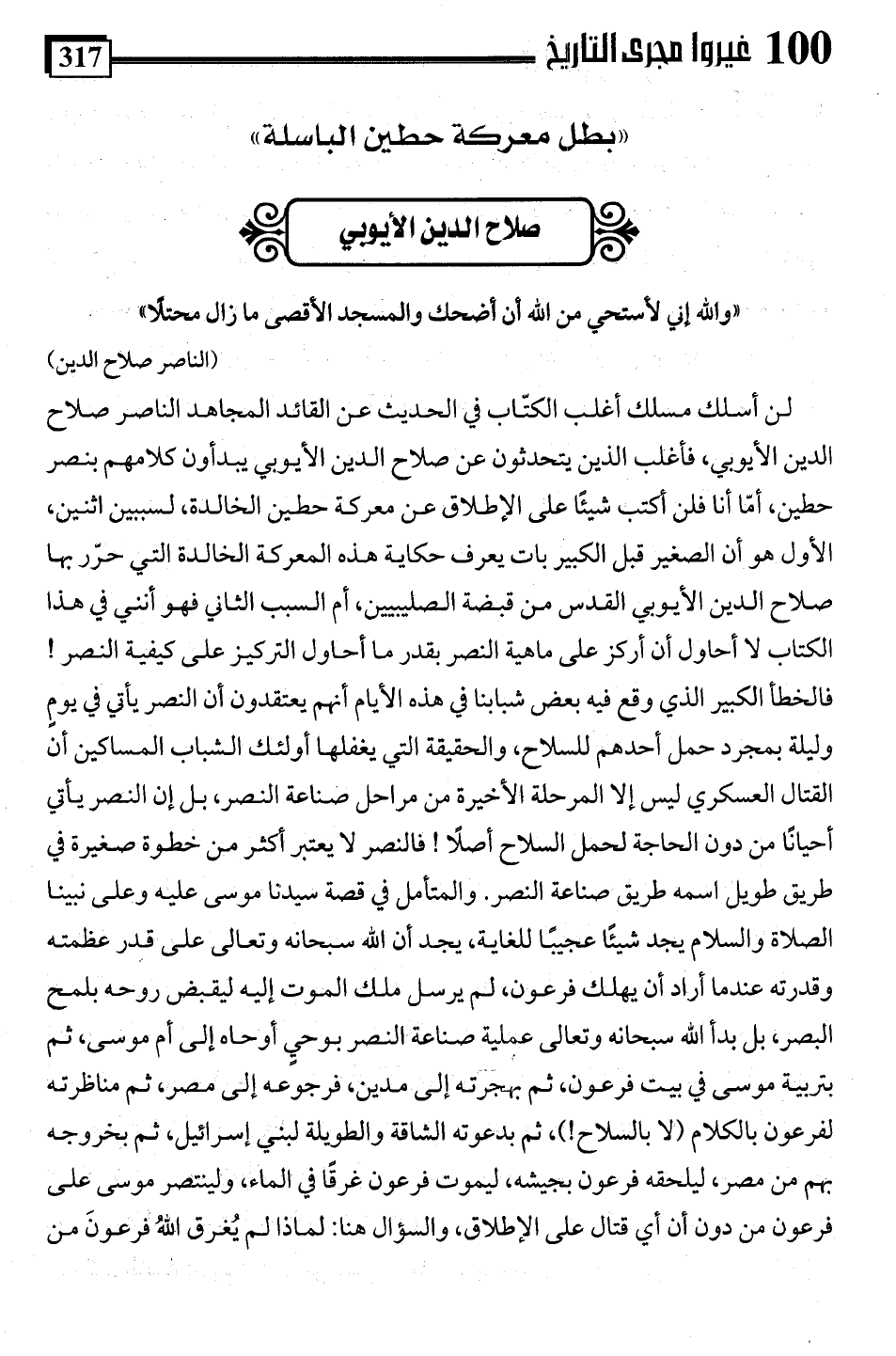 لن أسلك مسلك أغلب الكتّاب في الحديث عن القائد المجاهد الناصر صلاح الدين الأيوبي، فأغلب الذين يتحدثون عن صلاح الدين الأيوبي يبدأون كلامهم بنصر حطين، أمّا أنا فلن أكتب شيئًا على الإطلاق عن معركة حطين الخالدة، لسببين اثنين، الأول هو أن الصغير قبل الكبير بات يعرف حكاية هذه المعركة الخالدة التي حرّر بها صلاح الدين الأيوبي القدس من قبضة الصليبيين، أم السبب الثاني فهو أنني في هذا الكتاب لا أحاول أن أركز على ماهية النصر بقدر ما أحاول التركيز على كيفية النصر! فالخطأ الكبير الذي وقع فيه بعض شبابنا في هذه الأيام أنهم يعتقدون أن النصر يأتي في يومٍ وليلة بمجرد حمل أحدهم للسلاح، والحقيقة التي يغفلها أولئك الشباب المساكين أن القتال العسكري ليس إلا المرحلة الأخيرة من مراحل صناعة النصر، بل إن النصر يأتي أحيانًا من دون الحاجة لحمل السلاح أصلًا! فالنصر لا يعتبر أكثر من خطوة صغيرة في طريق طويل اسمه طريق صناعة النصر. والمتأمل في قصة سيدنا موسى عليه وعلى نبينا الصلاة والسلام يجد شيئًا عجيبًا للغاية، يجد أن اللَّه سبحانه وتعالى على قدر عظمته وقدرته عندما أراد أن يهلك فرعون، لم يرسل ملك الموت إليه ليقبض روحه بلمح البصر، بل بدأ اللَّه سبحانه وتعالى عملية صناعة النصر بوحيٍ أوحاه إلى أم موسى، ثم بتربية موسى في بيت فرعون، ثم بهجرته إلى مدين، فرجوعه إلى مصر، ثم مناظرته لفرعون بالكلام (لا بالسلاح!)، ثم بدعوته الشاقة والطويلة لبني إسرائيل، ثم بخروجه بهم من مصر، ليلحقه فرعون بجيشه، ليموت فرعون غرقًا في الماء، ولينتصر موسى على فرعون من دون أن أي قتال على الإطلاق، والسؤال هنا: لماذا لم يُغرق اللَّهُ فرعونَ من