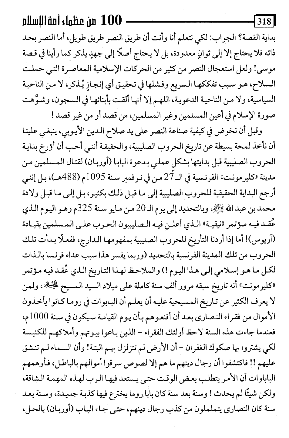 وقبل أن نخوض في كيفية صناعة النصر على يد صلاح الدين الأيوبي، ينبغي علينا أن نأخذ لمحة بسيطة عن تاريخ الحروب الصليبية، والحقيقة أنني أحب أن أؤرخ بداية الحروب الصليبية قبل بدايتها بشكلٍ عملي بدعوة البابا (أوربان) لقتال المسلمين من مدينة "كليرمونت" الفرنسية في الـ 27 من في نوفمبر سنة 1095 م (488 هـ)، بل إنني أرجع البداية الحقيقية للحروب الصليبية إلى ما قبل ذلك بكثير، بل إلى ما قبل ولادة محمد بن عبد اللَّه -صلى اللَّه عليه وسلم-، وبالتحديد إلى يوم إلى 20 من مايو سنة 325 م وهو اليوم الذي عُقد فيه مؤتمر "نيقية" الذي أعلن فيه الصليبيون الحرب على المسلمين بقيادة (آريوس)! أما إذا أردنا التأريخ للحروب الصليبية بمفهومها الدارج، ففعلًا بدأت تلك الحروب من تلك المدينة الفرنسية بالتحديد (وربما يفسر هذا سبب عداء فرنسا بالذات لكل ما هو إسلامي إلى هذا اليوم!) والملاحظ لهذا التاريخ الذي عُقد فيه مؤتمر "كليرمونت" أنه تاريخ سبقه مرور ألف سنة كاملة على ميلاد السيد المسيح عليه السلام، ولمن لا يعرف الكثير عن تاريخ المسيحية عليه أن يعلم أن البابوات في روما كانوا يأخذون الأموال من فقراء النصارى بعد أن أقنعوهم بأن يوم القيامة سيكون في سنة 1000 م، فعندما جاءت هذه السنة لاحظ أولئك الفقراء -الذين باعوا بيوتهم وأملاكهم للكنيسة لكي يشتروا بها صكوك الغفران- أن الأرض لم تتزلزل بهم البتة! وأن السماء لم تنشق عليهم!! فاكتشفوا أن رجال دينهم ما هم إلا لصوص سرقوا أموالهم بالباطل، فأوهمهم الباباوات أن الأمر يتطلب بعض الوقت حتى يستعد فيها الرب لهذه المهمة الشاقة، ولكن شيئًا لم يحدث! وسنة بعد سنة كان بابا روما يخترع فيها كذبة جديدة، وسنة بعد سنة كان النصارى يتململون من كذب رجال دينهم، حتى جاء الباب (أوربان) بالحل،