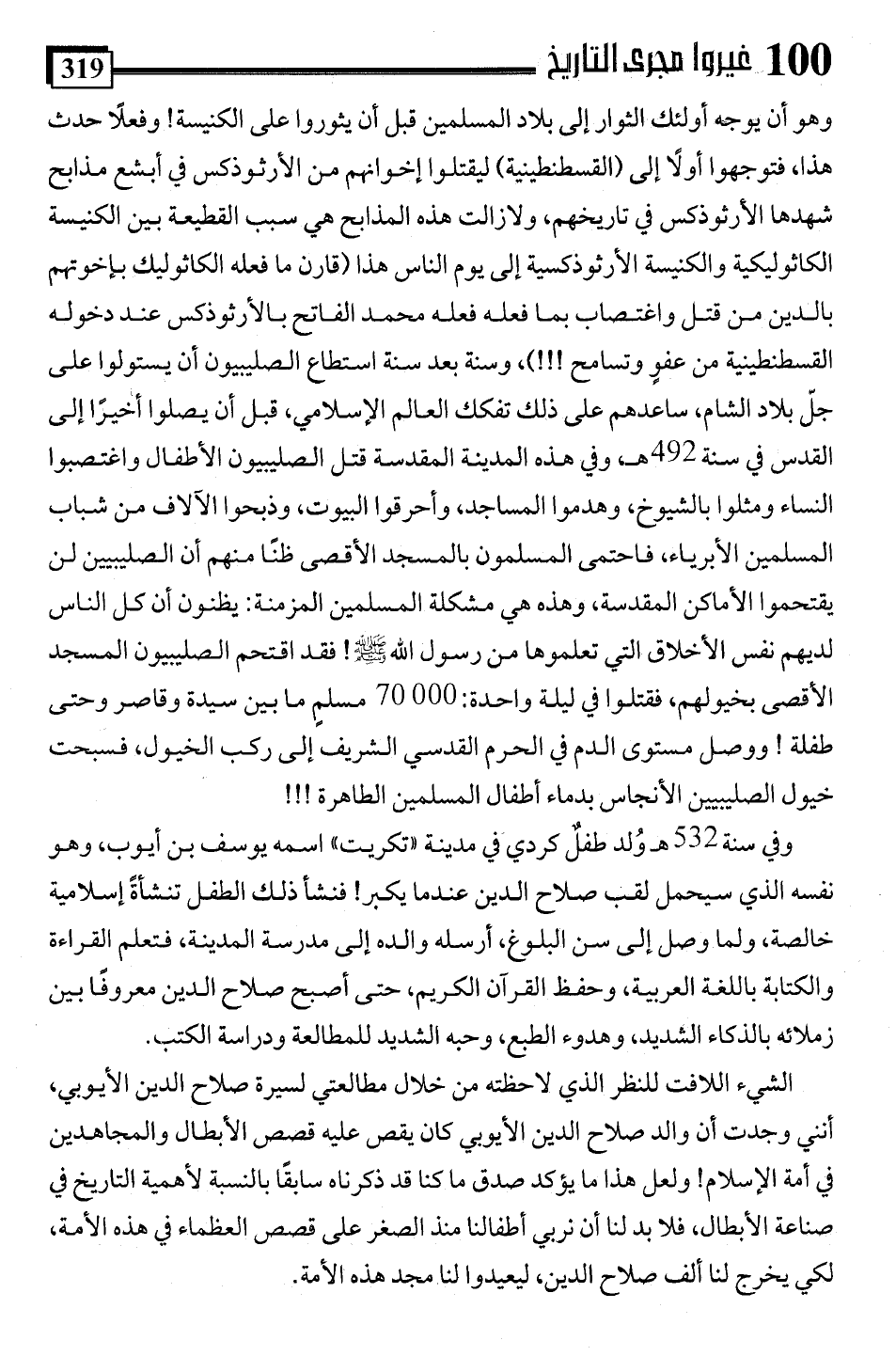 وهو أن يوجه أولئك الثوار إلى بلاد المسلمين قبل أن يثوروا على الكنيسة! وفعلًا حدث هذا، فتوجهوا أولًا إلى (القسطنطينية) ليقتلوا إخوانهم من الأرثوذكس في أبشع مذابح شهدها الأرثوذكس في تاريخهم، ولازالت هذه المذابح هي سبب القطيعة بين الكنيسة الكاثوليكية والكنيسة الأرثوذكسية إلى يوم الناس هذا (قارن ما فعله الكاثوليك بإخوتهم بالدين من قتل واغتصاب بما فعله محمد الفاتح بالأرثوذكس عند دخوله القسطنطينية من عفوٍ وتسامح!!!)، وسنة بعد سنة استطاع الصليبيون أن يستولوا على جلّ بلاد الشام، ساعدهم على ذلك تفكك العالم الإِسلامي، قبل أن يصلوا أخيرًا إلى القدس في سنة 492 هـ، وفي هذه المدينة المقدسة قتل الصليبيون الأطفال واغتصبوا النساء ومثلوا بالشيوخ، وهدموا المساجد، وأحرقوا البيوت، وذبحوا الآلاف من شباب المسلمين الأبرياء، فاحتمى المسلمون بالمسجد الأقصى ظنًا منهم أن الصليبيين لن يقتحموا الأماكن المقدسة، وهذه هي مشكلة المسلمين المزمنة: يظنون أن كل الناس لديهم نفس الأخلاق التي تعلموها من رسول اللَّه -صلى اللَّه عليه وسلم-! فقد اقتحم الصليبيون المسجد الأقصى بخيولهم، فقتلوا في ليلة واحدة: 70000 مسلمٍ ما بين سيدة وقاصر وحتى طفلة! ووصل مستوى الدم في الحرم القدسي الشريف إلى ركب الخيول، فسبحت خيول الصليبيين الأنجاس بدماء أطفال المسلمين الطاهرة!!!