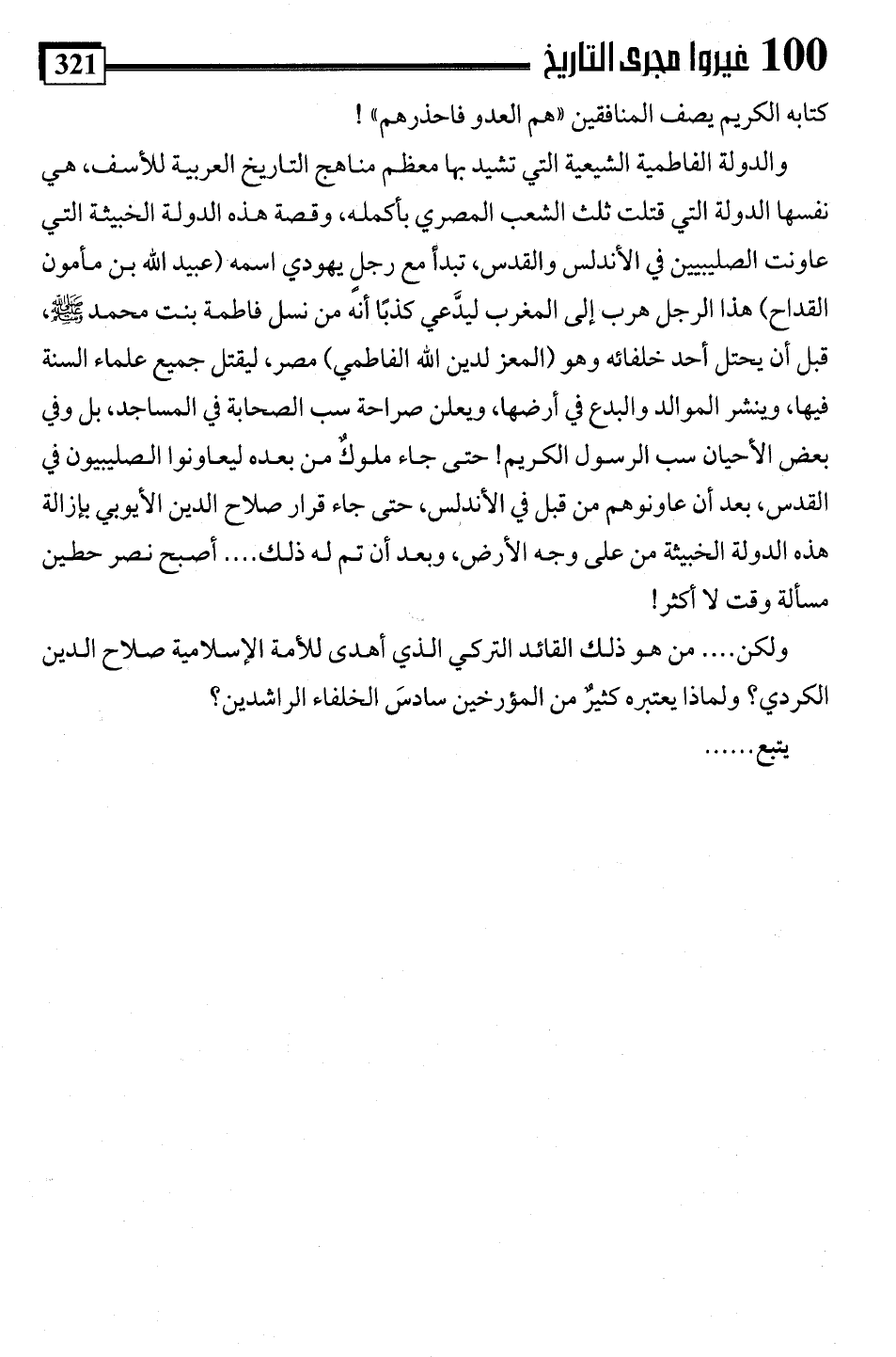 والدولة الفاطمية الشيعية التي تشيد بها معظم مناهج التاريخ العربية للأسف، هي نفسها الدولة التي قتلت ثلث الشعب المصري بأكمله، وقصة هذه الدولة الخبيثة التي عاونت الصليبيين في الأندلس والقدس، تعبدًا مع رجلٍ يهودي اسمه (عبيد اللَّه بن مأمون القداح) هذا الرجل هرب إلى المغرب ليدَّعي كذبًا أنه من نسل فاطمة بنت محمد -صلى اللَّه عليه وسلم-، قبل أن يحتل أحد خلفائه وهو (المعز لدين اللَّه الفاطمي) مصر، ليقتل جميع علماء السنة فيها، وينشر الموالد والبدع في أرضها، ويعلن صراحة سب الصحابة في المساجد، بل وفي بعض الأحيان سب الرسول الكريم! حتى جاء ملوكٌ من بعده ليعاونوا الصليبيون في القدس، بعد أن عاونوهم من قبل في الأندلس، حتى جاء قرار صلاح الدين الأيوبي بإزالة هذه الدولة الخبيثة من على وجه الأرض، وبعد أن تم له ذلك. . . . أصبح نصر حطين مسألة وقت لا أكثر!