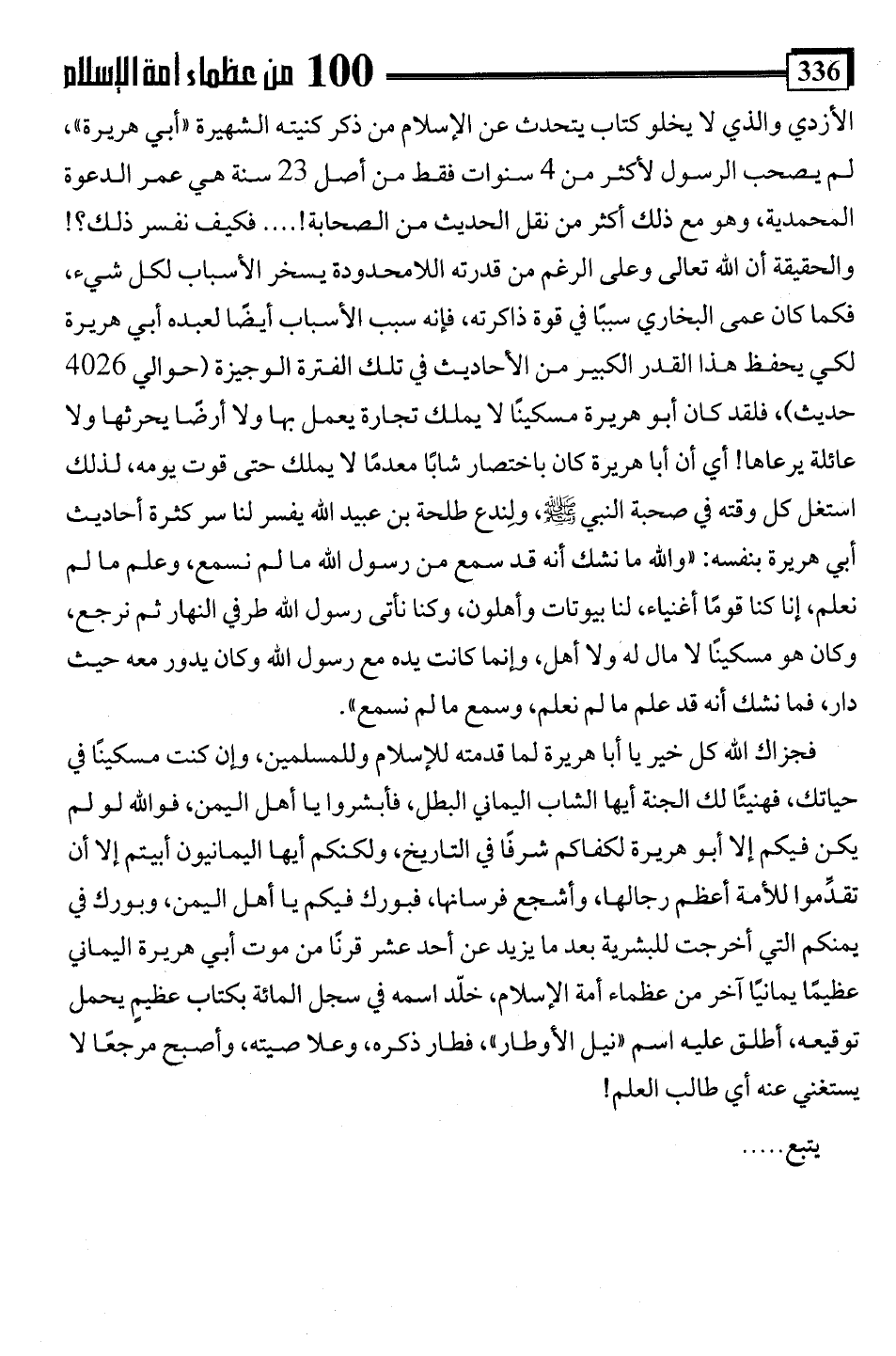 فجزاك اللَّه كل خير يا أبا هريرة لما قدمته للإسلام وللمسلمين، وإن كنت مسكينًا في حياتك، فهنيئًا لك الجنة أيها الشاب اليماني البطل، فأبشروا يا أهل اليمن، فواللَّه لو لم يكن فيكم إلا أبو هريرة لكفاكم شرفًا في التاريخ, ولكنكم أيها اليمانيون أبيتم إلا أن تقدِّموا للأمة أعظم رجالها، وأشجع فرسانها، فبورك فيكم يا أهل اليمن، وبورك في يمنكم التي أخرجت للبشريية بعد ما يزيد عن أحد عشر قرنًا من موت أبي هريرة اليماني عظيمًا يمانيًا آخر من عظماء أمة الإِسلام، خلّد اسمه في سجل المائة بكتاب عظيمٍ يحمل توقيعه، أطلق عليه اسم "نيل الأوطار"، فطار ذكره، وعلا صيته، وأصبح مرجعًا لا يستغني عنه أي طالب العلم!