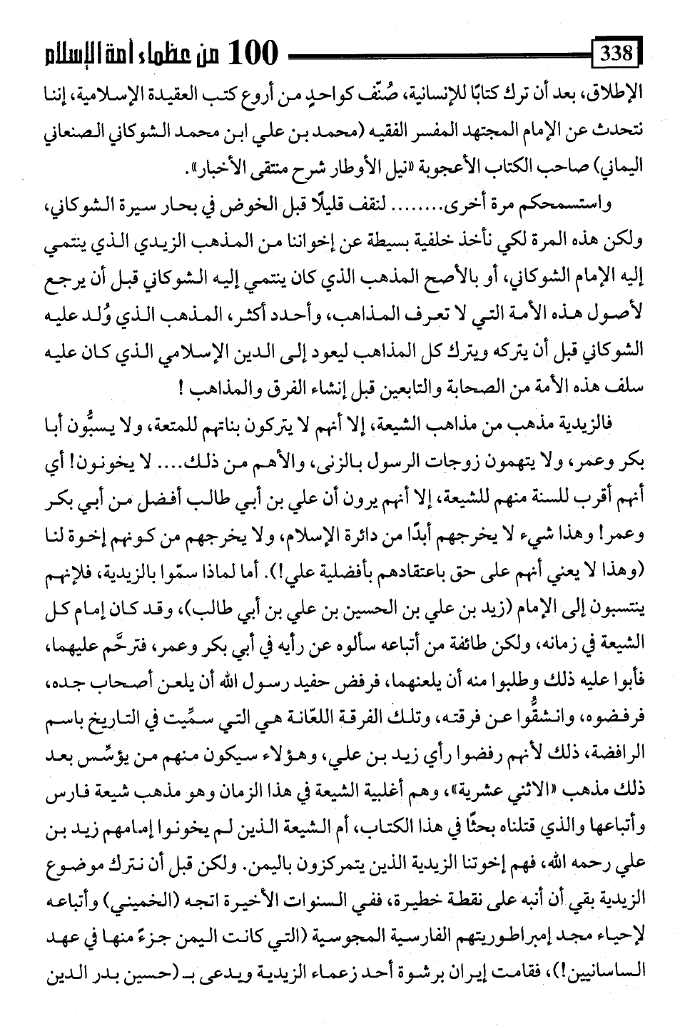 فالزيدية مذهب من مذاهب الشيعة، إلا أنهم لا يتركون بناتهم للمتعة، ولا يسبُّون أبا بكر وعمر، ولا يتهمون زوجات الرسول بالزنى، والأهم من ذلك. . . . لا يخونون! أي أنهم أقرب للسنة منهم للشيعة، إلا أنهم يرون أن علي بن أبي طالب أفضل من أبي بكر وعمر! وهذا شيء لا يخرجهم أبدًا من دائرة الإِسلام، ولا يخرجهم من كونهم إخوة لنا (وهذا لا يعني أنهم على حق باعتقادهم بأفضلية علي!). أما لماذا سمّوا بالزيدية، فلإنهم ينتسبون إلى الإِمام (زيد بن علي بن الحسين بن علي بن أبي طالب)، وقد كان إمام كل الشيعة في زمانه، ولكن طائفة من أتباعه سألوه عن رأيه في أبي بكر وعمر، فترحَّم عليهما، فأبوا عليه ذلك وطلبوا منه أن يلعنهما، فرفض حفيد رسول اللَّه أن يلعن أصحاب جده، فرفضوه، وانشقُّوا عن فرقته، وتلك الفرقة اللعّانة هي التي سمِّيت في التاريخ باسم الرافضة، ذلك لأنهم رفضوا رأي زيد بن علي، وهؤلاء سيكون منهم من يؤسّس بعد ذلك مذهب "الاثني عشرية"، وهم أغلبية الشيعة في هذا الزمان وهو مذهب شيعة فارس وأتباعها والذي قتلناه بحثًا في هذا الكتاب، أم الشيعة الذين لم يخونوا إمامهم زيد بن علي رحمه اللَّه، فهم إخوتنا الزيدية الذين يتمركزون باليمن. ولكن قبل أن نترك موضوع الزيدية بقي أن أنبه على نقطة خطيرة، ففي السنوات الأخيرة اتجه (الخميني) وأتباعه لإحياء مسجد إمبراطوريتهم الفارسية المجوسية (التي كانت اليمن جزء منها في عهد الساسانيين!)، فقامت إيران برشوة أحد زعماء الزيدية ويدعى بـ (حسين بدر الدين