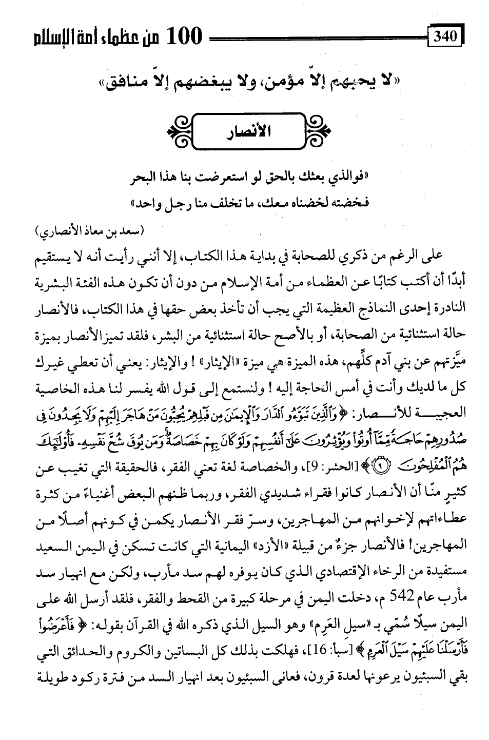 على الرغم من ذكري للصحابة في بداية هذا الكتاب، إلا أنني رأيت أنه لا يستقيم أبدًا أن أكتب كتابًا عن العظماء من أمة الإسلام من دون أن تكون هذه الفئة البشرية النادرة إحدى النماذج العظيمة التي يجب أن تأخذ بعض حقها في هذا الكتاب، فالأنصار حالة استثنائية من الصحابة، أو بالأصح حالة استثنائية من البشر، فلقد تميز الأنصار بميزة ميَّزتهم عن بني آدم كلِّهم، هذه الميزة هي ميزة "الإيثار"! والإيثار: يعني أن تعطي غيرك كل ما لديك وأنت في أمس الحاجة إليه! ولنستمع إلى قول اللَّه يفسر لنا هذه الخاصية العجيبة للأنصار: {وَالَّذِينَ تَبَوَّءُوا الدَّارَ وَالْإِيمَانَ مِنْ قَبْلِهِمْ يُحِبُّونَ مَنْ هَاجَرَ إِلَيْهِمْ وَلَا يَجِدُونَ فِي صُدُورِهِمْ حَاجَةً مِمَّا أُوتُوا وَيُؤْثِرُونَ عَلَى أَنْفُسِهِمْ وَلَوْ كَانَ بِهِمْ خَصَاصَةٌ وَمَنْ يُوقَ شُحَّ نَفْسِهِ فَأُولَئِكَ هُمُ الْمُفْلِحُونَ (9)} [الحشر: 9]، والخصاصة لغة تعني الفقر، فالحقيقة التي تغيب عن كثيرٍ منّا أن الأنصار كانوا فقراء شديدي الفقر، وربما ظنهم البعض أغنياءً من كثرة عطاءاتهم لإخوانهم من المهاجرين، وسرّ فقر الأنصار يكمن في كونهم أصلًا من المهاجرين! فالأنصار جزءٌ من قبيلة "الأزد" اليمانية التي كانت تسكن في اليمن السعيد مستفيدة من الرخاء الإقتصادي الذي كان يوفره لهم سد مأرب، ولكن مع انهيار سد مأرب عام 542 م، دخلت اليمن في مرحلة كبيرة من القحط والفقر، فلقد أرسل اللَّه على اليمن سيلًا سُمّي بـ "سيل العَرِم" وهو السيل الذي ذكره اللَّه في القرآن بقوله: {فَأَعْرَضُوا فَأَرْسَلْنَا عَلَيْهِمْ سَيْلَ الْعَرِمِ} [سبأ: 16] فهلكت بذلك كل البساتين والكروم والحدائق التي بقي السبئيون يرعونها لعدة قرون، فعانى السبئيون بعد انهيار السد من فترة ركود طويلة