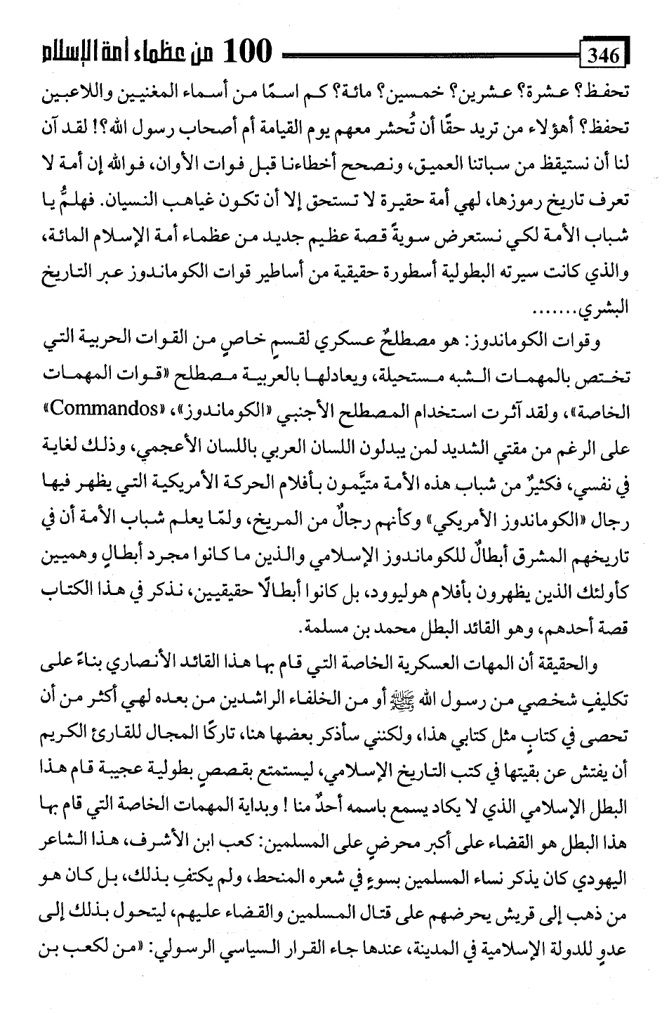 تحفظ؟ عشرة؟ عشرين؟ خمسين؟ مائة؟ كم اسمًا من أسماء المغنيين واللاعبين تحفظ؟ أهؤلاء من تريد حقًا أن تُحشر معهم يوم القيامة أم أصحاب رسول اللَّه؟! لقد آن لنا أن نستيقظ من سباتنا العميق، ونصحح أخطاءنا قبل فوات الأوان، فواللَّه إن أمة لا تعرف تاريخ رموزها, لهي أمة حقيرة لا تستحق إلا أن تكون غياهب النسيان. فهلمُّ يا شباب الأمة لكي نستعرض سويةً قصة عظيم جديد من عظماء أمة الإِسلام المائة، والذي كانت سيرته البطولية أسطورة حقيقية من أساطير قوات الكوماندوز عبر التاريخ البشري. . . .