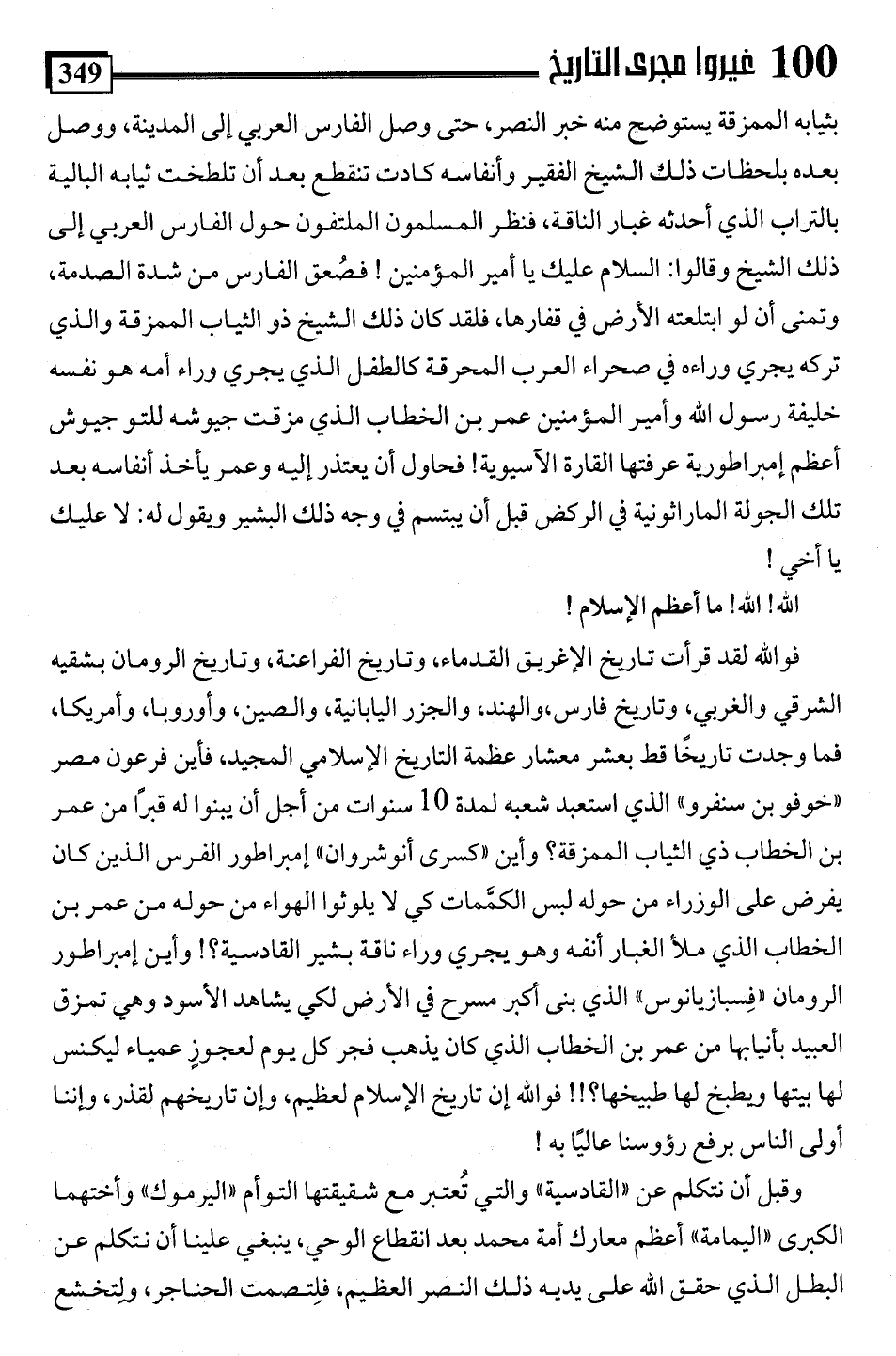 فواللَّه لقد قرأت تاريخ الإغريق القدماء، وتاريخ الفراعنة، وتاريخ الرومان بشقيه الشرقي والغربي، وتاريخ فارس، والهند، والجزر اليابانية، والصين، وأوروبا، وأمريكا، فما وجدت تاريخًا قط بعشر معشار عظمة التاريخ الإِسلامي المجيد، فأين فرعون مصر "خوفو بن سنفرو" الذي استعبد شعبه لمدة 10 سنوات من أجل أن يبنوا له قبرًا من عمر بن الخطاب ذي الثياب الممزقة؟ وأين "كسرى أنوشروان" إمبراطور الفرس الذين كان يفرض على الوزراء من حوله لبس الكممات كي لا يلوثوا الهواء من حوله من عمر بن الخطاب الذي ملأ الغبار أنفه وهو يجري وراء ناقة بشير القادسية؟! وأين إمبراطور الرومان "فِسبازيانوس" الذي بني أكبر مسرح في الأرض لكي يشاهد الأسود وهي تمزق العبيد بأنيابها من عمر بن الخطاب الذي كان يذهب فجر كل يوم لعجوزٍ عمياء ليكنس لها بيتها ويطبخ لها طبيخها؟!! فواللَّه إن تاريخ الإِسلام لعظيم، وإن تاريخهم لقذر، وإننا أولى الناس برفع رؤوسنا عاليًا به!