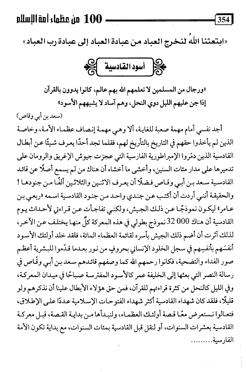 أجد نفسي أمام مهمة صعبة للغاية، ألا وهي مهمة إنصاف عظماء الأمة، وخاصة الذين لم يأخذوا حقهم في التاريخ بالتأريخ لهم، فقلما تجد أحدًا يعرف شيئًا عن أبطال القادسية الذين دمّروا الإمبراطورية الفارسية التي عجزت جيوش الإغريق والرومان على تدميرها على مدار مئات السنين، وأخشى ما أخشاه أن هناك من لم يسمع أصلًا عن قائد القادسية سعد بن أبي وقاص فضلًا أن يعرف الاثنين والثلاثين ألفا من جنودها! والحقيقة أنني أردت أن أكتب عن جندي واحد من جنود القادسية اسمه "ربعي بن عامر" ليكون نموذجًا عن ذلك الجيش، ولكني تفاجأت عن قراءتي لأحداث يوم القادسية أن هناك 32000 نموذج بطولي في هذه المعركة كلٌ منها يختلف عن الآخر، لذلك آثرت أن أضم ذلك الجيش بأسره لقائمة العظماء المائة، فلقد خلد أولئك الأسود أنفسَهم بأنفسِهم في سجل الخلود الإنساني بحروفٍ من نور بعدما قدّموا للبشرية أعظم صور الفداء والتضحية، فكانوا رحمهم اللَّه كما وصفهم قائدهم سعد بن أبي وقّاص في رسالة النصر التي بعثها إلى الخليفة عمر كالأسود المفترسة صباحًا في ميدان المعركة، وفي الليل كالنحل من كثرة قراءتهم للقرآن، فمن حق هؤلاء الأبطال علينا أن نذكرهم ولو قليلًا، فلقد كان شهداء القادسية أكثر شهداء الفتوحات الإسلامية عددًا على الإطلاق، فتعالوا نستعرض معًا قصة أولئك العظماء، ولنبدأها من بداية القصة، قبل معركة القادسية بعشرات السنوات، أو لنقل قبل القادسية بمئات السنوات، مع بداية تكون الأمة الفارسية. . . .