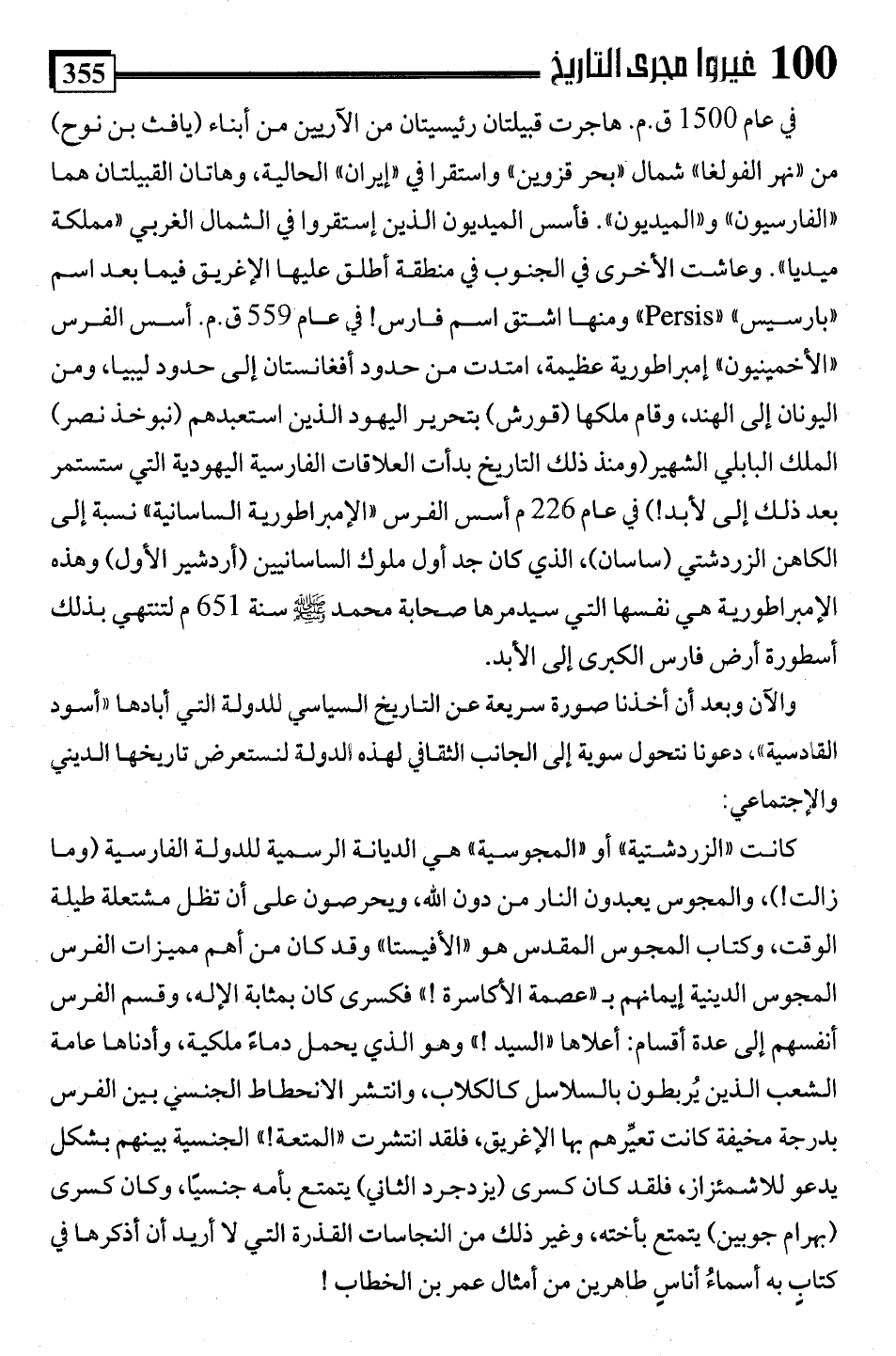 كانت "الزردشتية" أو "المجوسية" هي الديانة الرسمية للدولة الفارسية (وما زالت!)، والمجوس يعبدون النار من دون اللَّه، ويحرصون على أن تظل مشتعلة طيلة الوقت، وكتاب المجوس المقدس هو "الأفيستا" وقد كان من أهم مميزات الفرس المجوس الدينية إيمانهم بـ "عصمة الأكاسرة! " فكسرى كان بمثابة الإله، وقسم الفرس أنفسهم إلى عدة أقسام: أعلاها "السيد" وهو الذي يحمل دماءً ملكية، وأدناها عامة الشعب الذين يُربطون بالسلاسل كالكلاب، وانتشر الانحطاط الجنسي بين الفرس بدرجة مخيفة كانت تعيِّرهم بها الإغريق، فلقد انتشرتا "المتعة" الجنسية بينهم بشكل يدعو للاشمئزاز، فلقد كان كسرى (يزدجرد الثاني) يتمتع بأمه جنسيًا، وكان كسرى (بهرام جوبين) يتمتع بأخته، وغير ذلك من النجاسات القذرة التي لا أريد أن أذكرها في كتابٍ به أسماءُ أناسٍ طاهرين من أمثال عمر بن الخطاب!