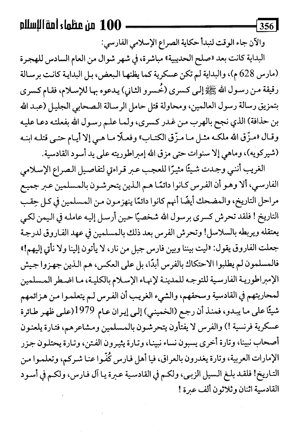 الغريب أنني وجدت شيئًا مثيرًا للعجب عبر قراءتي لتفاصيل الصراع الإسلامي الفارسي، ألا وهو أن الفرس كانوا دائمًا هم الذين يتحرشون بالمسلمين عبر جميع مراحل التاريخ، والمضحك أيضًا أنهم كانوا دائمًا ينهزمون من المسلمين في كل حِقب التاريخ! فلقد تحرش كسرى برسول اللَّه شخصيًا حين أرسل إليه عامله في اليمن لكي يعتقله ويربطه بالسلاسل! وتحرش الفرس بعد ذلك بالمسلمين في عهد الفاروق لدرجة جعلت الفاروق يقول: "ليت بيننا وبين فارس جبل من نار، لا يأتون إلينا ولا نأتي إليهم! " فالمسلمون لم يطلبوا الاحتكاك بالفرس أبدًا، بل على العكس، هم الذين جهزوا جيش الإمبراطورية الفارسية للتوجه للمدينة لإنهاء الإسلام بالكلية، ما اضطر المسلمين لمحاربتهم في القادسية وسحقهم، والشيء الغريب أن الفرس لم يتعلموا من هزائمهم شيئًا على ما يبدو، فمنذ أن رجع (الخميني) إلى إيران عام 1979 (على ظهر طائرة عسكرية فرنسية!) والفرس لا يفتأون يتحرشون بالمسلمين ومشاعرهم، فتارة يلعنون أصحاب نبينا، وتارة أخرى يسبون نساء نبينا، وتارة يثيرون الفتن، وتارة يحتلون جزر الإمارات العربية، وتارة يغدرون بالعراق، فيا أهل فارس كُفّوا عنا شركم، وتعلموا من التاريخ! فلقد بلغ السيل الزبى، ولكم في القادسية عبرة يا آل فارس، ولكم في أسود القادسية اثنان وثلاثون ألف عبرة!