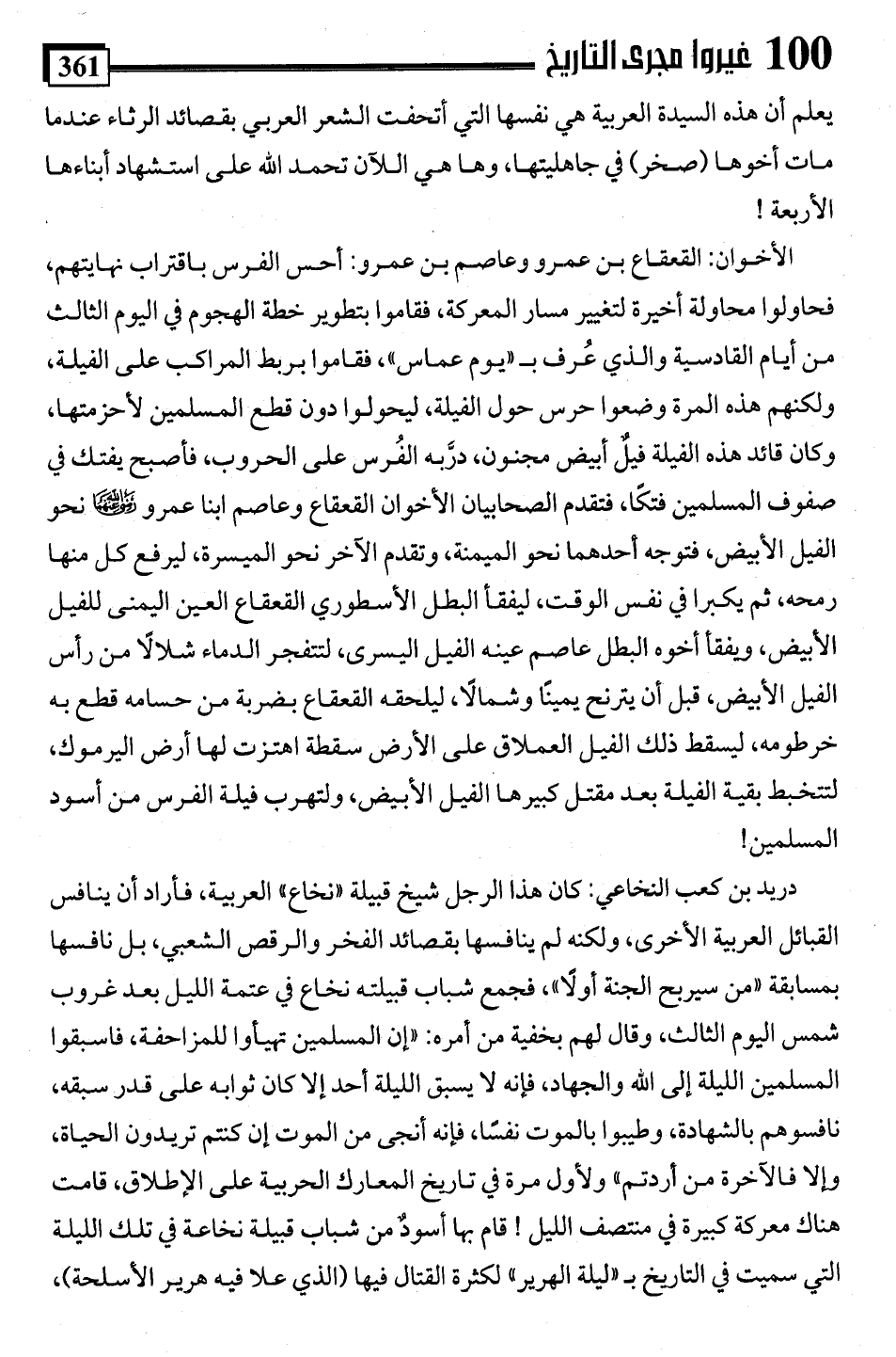 الأخوان: القعقاع بن عمرو وعاصم بن عمرو: أحس الفرس باقتراب نهايتهم، فحاولوا محاولة أخيرة لتغيير مسار المعركة، فقاموا بتطوير خطة الهجوم في اليوم الثالث من أيام القادسية والذي عُرف بـ "يوم عماس"، فقاموا بربط المراكب على الفيلة، ولكنهم هذه المرة وضعوا حرس حول الفيلة، ليحولوا دون قطع المسلمين لأحزمتها، وكان قائد هذه الفيلة فيلٌ أبيض مجنون، درَّبه الفُرس على الحروب، فأصبح يفتك في صفوف المسلمين فتكًا، فتقدم الصحابيان الأخوان القعقاع وعاصم ابنا عمرو -رضي اللَّه عنهم- نحو الفيل الأبيض، فتوجه أحدهما نحو الميمنة، وتقدم الآخر نحو الميسرة، ليرفع كل منها رمحه، ثم يكبرا في نفس الوقت، ليفقأ البطل الأسطوري القعقاع العين اليمنى للفيل الأبيض، ويفقا أخوه البطل عاصم عينه الفيل اليسرى، لتتفجر الدماء شلالًا من رأس الفيل الأبيض، قبل أن يترنح يمينا وشمالًا، ليلحقه القعقاع بضربة من حسامه قطع به خرطومه، ليسقط ذلك الفيل العملاق على الأرض سقطة اهتزت لها أرض اليرموك، لتتخبط بقية الفيلة بعد مقتل كبيرها الفيل الأبيض، ولتهرب فيلة الفرس من أسود المسلمين!