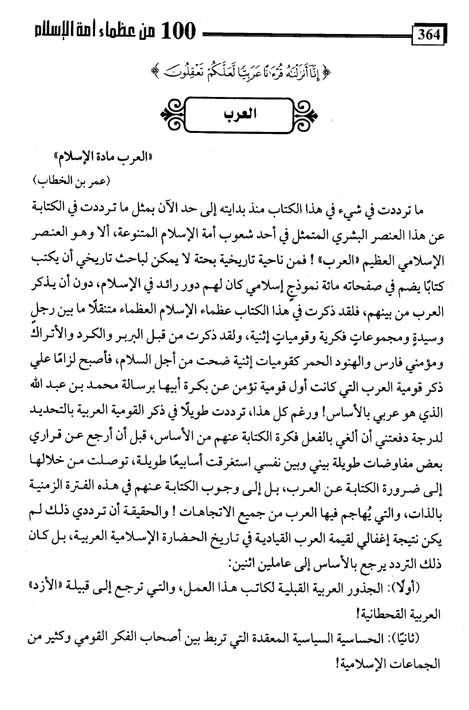 ما ترددت في شيء في هذا الكتاب منذ بدايته إلى حد الآن بمثل ما ترددت في الكتابة عن هذا العنصر البشري المتمثل في أحد شعوب أمة الإسلام المتنوعة، ألا وهو العنصر الإسلامي العظيم "العرب"! فمن ناحية تاريخية بحتة لا يمكن لباحث تاريخي أن يكتب كتابًا يضم في صفحاته مائة نموذجٍ إسلامي كان لهم دور رائد في الإسلام، دون أن يذكر العرب من بينهم، فلقد ذكرت في هذا الكتاب عظماء الإسلام العظماء متنقلًا ما بين رجل وسيدةٍ ومجموعاتٍ فكرية وقومياتٍ إثنية، ولقد ذكرت من قبل البربر والكرد والأتراك ومؤمني فارس والهنود الحمر كقوميات إثنية ضحت من أجل السلام، فأصبح لزامًا علي ذكر قومية العرب التي كانت أول قومية تؤمن عن بكرة أبيها برسالة محمد بن عبد اللَّه الذي هو عربي بالأساس! ورغم كل هذا، ترددت طويلًا في ذكر القومية العربية بالتحديد لدرجة دفعتني أن ألغي بالفعل فكرة الكتابة عنهم من الأساس، قبل أن أرجع عن قراري بعض مفاوضات طويلة بيني وبين نفسي استغرقت أسابيعًا طويلة، توصلت من خلالها إلى ضرورة الكتابة عن العرب، بل إلى وجوب الكتابة عنهم في هذه الفترة الزمنية بالذات، والتي يُهاجم فيها العرب من جميع الاتجاهات! والحقيقة أن ترددي ذلك لم يكن نتيجة إغفالي لقيمة العرب القيادية في تاريخ الحضارة الإسلامية العربية، بل كان ذلك التردد يرجع بالأساس إلى عاملين اثنين: