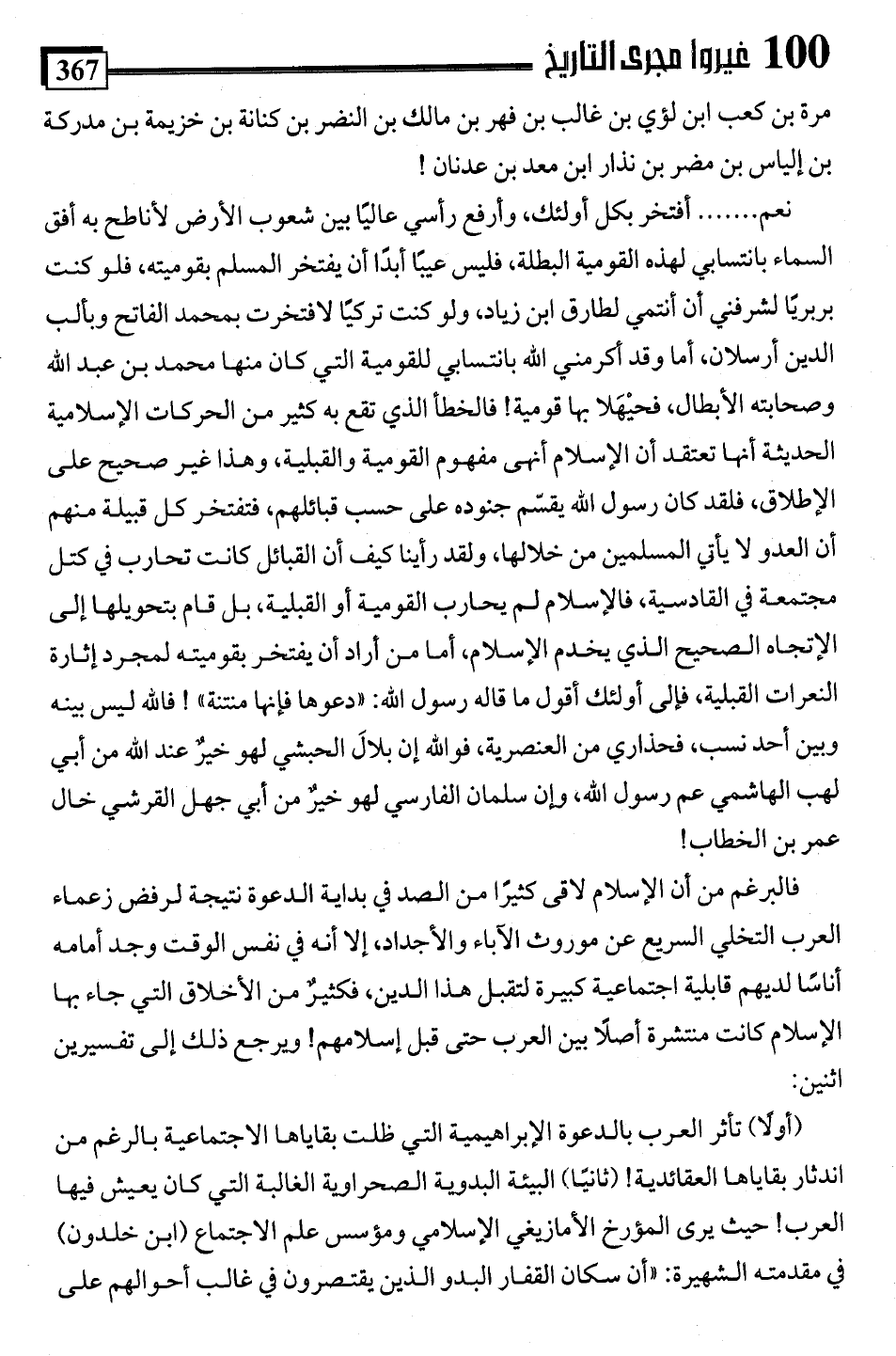نعم. . . . . أفتخر بكل أولئك، وأرفع رأسي عاليًا بين شعوب الأرض لأناطح به أفق السماء بانتسابي لهذه القومية البطلة، فليس عيبًا أبدًا أن يفتخر المسلم بقوميته، فلو كنت بربريًا لشرفني أن أنتمي لطارق ابن زياد، ولو كنت تركيًا لافتخرت بمحمد الفاتح وبألب الدين أرسلان، أما وقد اكرمني اللَّه بانتسابي للقومية التي كان منها محمد بن عبد اللَّه وصحابته الأبطال، فحيْهَلا بها قومية! فالخطأ الذي تقع به كثير من الحركات الإسلامية الحديثة أنها تعتقد أن الإسلام أنهى مفهوم القومية والقبلية، وهذا غير صحيح على الإطلاق، فلقد كان رسول اللَّه يقسّم جنوده على حسب قبائلهم، فتفتخر كل قبيلة منهم أن العدو لا يأتي المسلمين من خلالها، ولقد رأينا كيف أن القبائل كانت تحارب في كتل مجتمعة في القادسية، فالإسلام لم يحارب القومية أو القبلية، بل قام بتحويلها إلى الإتجاه الصحيح الذي يخدم الإسلام، أما من أراد أن يفتخر بقوميته لمجرد إثارة النعرات القبلية، فإلى أولئك أقول ما قاله رسول اللَّه: "دعوها فإنها منتنة"! فاللَّه ليس بينه وبين أحد نسب، فحذاري من العنصرية، فواللَّه إن بلالَ الحبشي لهو خيرٌ عند اللَّه من أبي لهب الهاشمي عم رسول اللَّه، وإن سلمان الفارسي لهو خيرٌ من أبي جهل القرشي خال عمر بن الخطاب!