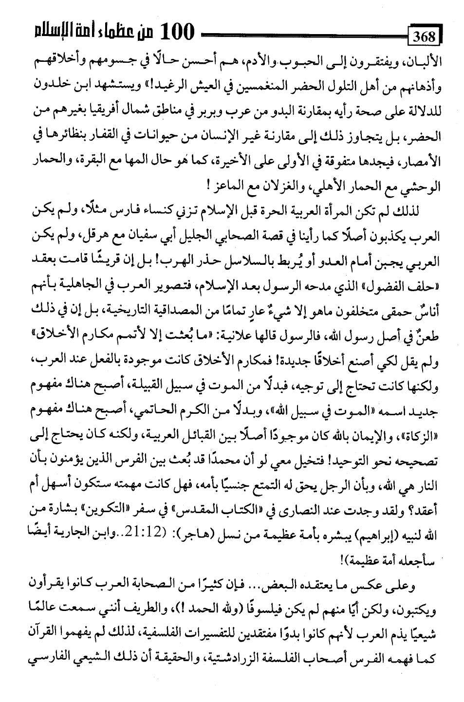 لذلك لم تكن المرأة العربية الحرة قبل الإسلام تزني كنساء فارس مثلًا، ولم يكن العرب يكذبون أصلًا كما رأينا في قصة الصحابي الجليل أبي سفيان مع هرقل، ولم يكن العربي يجبن أمام العدو أو يُربط بالسلاسل حذر الهرب! بل إن قريشًا قامت بعقد "حلف الفضول" الذي مدحه الرسول بعد الإسلام، فتصوير العرب في الجاهلية بأنهم أناسٌ حمقى متخلفون ما هو إلا شيءٌ عارٍ تمامًا من المصداقية التاريخية، بل إن في ذلك طعنٌ في أصل رسول اللَّه، فالرسول قالها علانية: "ما بُعثت إلا لأتمم مكارم الأخلاق" ولم يقل لكي أصنع أخلاقًا جديدة! فمكارم الأخلاق كانت موجودة بالفعل عند العرب، ولكنها كانت تحتاج إلى توجيه، فبدلًا من الموت في سبيل القبيلة، أصبح هناك مفهوم جديد اسمه "الموت في سبيل اللَّه"، وبدلًا من الكرم الحاتمي، أصبح هناك مفهوم "الزكاة"، والإيمان باللَّه كان موجودًا أصلًا بين القبائل العربية، ولكنه كان يحتاج إلى تصحيحه نحو التوحيد! فتخيل معي لو أن محمدًا قد بُعث بين الفرس الذين يؤمنون بأن النار هي اللَّه، وبأن الرجل يحق له التمتع جنسيًا بأمه، فهل كانت مهمته ستكون أسهل أم أعقد؛ ولقد وجدت عند النصارى في "الكتاب المقدس" في سفر "التكوين" بشارة من اللَّه لنبيه (إبراهيم) يبشره بأمة عظيمة من نسل (هاجر): (12: 12. . وابن الجارية أيضًا سأجعله أمة عظيمة)!