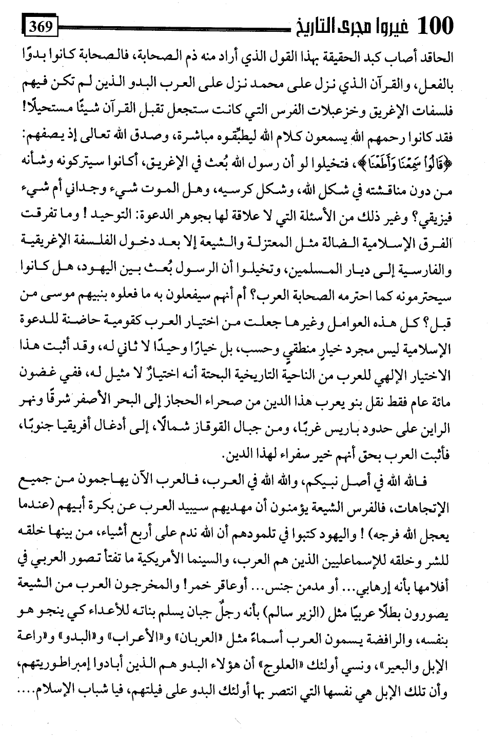 فاللَّه اللَّه في أصل نبيكم، واللَّه اللَّه في العرب، فالعرب الآن يهاجمون من جميع الإتجاهات، فالفرس الشيعة يؤمنون أن مهديهم سيبيد العرب عن بكرة أبيهم (عندما يعجل اللَّه فرجه)! واليهود كتبوا في تلمودهم أن اللَّه ندم على أربع أشياء، من بينها خلقه للشر وخلقه للإسماعليين الذين هم العرب، والسينما الأمريكية ما تفتأ تصور العربي في أفلامها بأنه إرهابي. . . أو مدمن جنس. . . أو عاقر خمر! والمخرجون العرب من الشيعة يصورون بطلًا عربيًا مثل (الزير سالم) بأنه رجل جبان يسلم بناته للأعداء كي ينجو هو بنفسه، والرافضة يسمون العرب أسماءً مثل "العربان" و"الأعراب" و"البدو" و"راعة الإبل والبعير"، ونسي أولئك "العلوج" أن هؤلاء البدو هم الذين أبادوا إمبراطوريتهم، وأن تلك الإبل هي نفسها التي انتصر بها أولئك البدو على فيلتهم، فيا شباب الإسلام. . . .