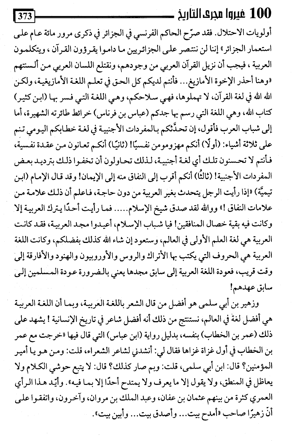 أولويات الاحتلال. فقد صرّح الحاكم الفرنسي في الجزائر في ذكرى مرور مائة عام على استعمار الجزائر "إننا لن ننتصر على الجزائريين ما داموا يقرؤون القرآن، ويتكلمون العربية، فيجب أن نزيل القرآن العربي من وجودهم، ونقتلع اللسان العربي من ألسنتهم" وهنا أحذر الإخوة الأمازيغ. . . فأنتم لديكم كل الحق في تعلم اللغة الأمازيغية، ولكن اللَّه اللَّه في لغة القرآن، لا تهملوها، فهي سلاحكم، وهي اللغة التي فسر بها (ابن كثير) كتاب اللَّه، وهي اللغة التي رسم بها جدكم (عباس بن فرناس) خرائط طائرته الشهيرة، أما إلى شباب العرب فأقول، إن تحدَّثكم بالمفردات الأجنبية في لغة خطابكم اليومي تنم على ثلاثة أشياء: (أولًا) أنكم مهزومومن نفسيًا! (ثانيًا) أنكم تعانون من عقدة نفسية، فأنتم لا تحسنون تلك أي لغة أجنبية، لذلك تحاولون أن تخفوا ذلك بترديد بعض المفردات الأجنبية! (ثالثًا) أنكم أقرب إلى النفاق منه إلى الإيمان! وقد قال الإمام (ابن تيميَّة) "إذا رأيت الرجل يتحدث بغير العربية من دون حاجة، فاعلم أن ذلك علامة من علامات النفاق! " وواللَّه لقد صدق شيخ الإسلام. . . . فما رأيت أحدًا يترك العربية إلا وكانت فيه بقية خصال المنافقين! فيا شباب الإسلام، أعيدوا مجد العربية، فقد كانت العربية هي لغة العلم الأولى في العالم، وستعود إن شاء اللَّه كذلك بفضلكم، وكانت اللغة العربية هي الحروف التي يكتب بها الأتراك والروس والأوروبيون والهنود والأفارقة إلى وقت قريب، فعودة اللغة العربية إلى سابق مجدها يعني بالضرورة عودة المسلمين إلى سابق عهدهم!