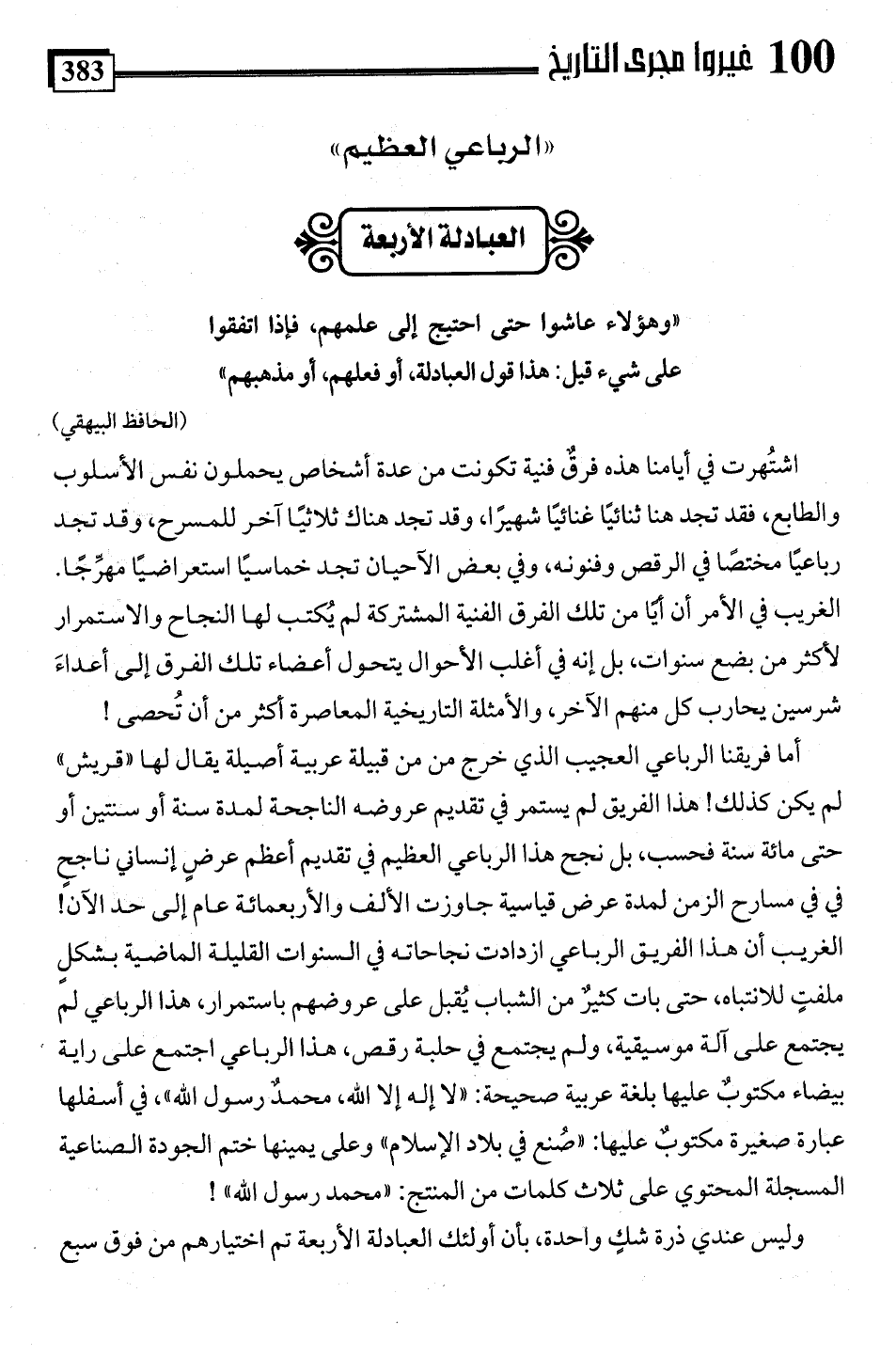 أما فريقنا الرباعي العجيب الذي خرج من من قبيلة عربية أصيلة يقال لها "قريش" لم يكن كذلك! هذا الفريق لم يستمر في تقديم عروضه الناجحة لمدة سنة أو سنتين أو حتى مائة سنة فحسب، بل نجح هذا الرباعي العظيم في تقديم أعظم عرضٍ إنساني ناجحٍ في مسارح الزمن لمدة عرض قياسية جاوزت الألف والأربعمائة عام إلى حد الآن! الغريب أن هذا الفريق الرباعي ازدادت نجاحاته في السنوات القليلة الماضية بشكلٍ ملفتٍ للانتباه، حتى بات كثيرٌ من الشبان يُقبل محلى عروضهم باستمرار، هذا الرباعي لم يجتمع على آلة موسيقية، ولم يجتمع على حلبة رقص، هذا الرباعي اجتمع على راية بيضاء مكتوب عليها بلغة عربية صحيحة: "لا إله إلا اللَّه، محمد رسول اللَّه"، في أسفلها عبارة صغيرة مكتوبٌ عليها: "صُنع في بلاد الإسلام" وعلى يمينها ختم الجودة الصناعية المسجلة المحتوي على ثلاث كلمات من المنتج: "محمد رسول اللَّه"!