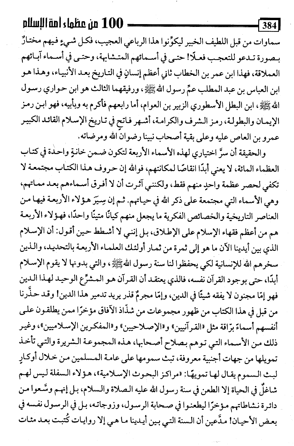الحقيقة أن سرَّ اختياري لهذه الأسماء الأربعة لتكون ضمن خانةٍ واحدة في كتاب العظماء المائة، لا يعني أبدًا انقاصًا لمكانتهم، فواللَّه إن حروف هذا الكتاب مجتمعة لا تكفي لحصر عظمة واحدٍ منهم فقط، ولكنني آثرت أن لا أفرق أسماءهم بعد مماتهم، وهي الأسماء التي مجتمعة على ذكر اللَّه في حياتهم. ثم إن سِيَرَ هؤلاء الأربعة فيها من العناصر التاريخية والخصائص الفكرية ما يجعل منهم كيانًا متينًا واحدًا، فهؤلاء الأربعة هم من أعظم فقهاء الإسلام على الإطلاق، بل إنني لا أشطط حين أقول: أن الإسلام الذي بين أيدينا الآن ما هو إلى ثمرة من ثمار أولئك العلماء الأربعة بالتحديد، والذين سخرهم اللَّه للإنسانية لكي يحفظوا لنا سنة رسول اللَّه -صلى اللَّه عليه وسلم-، والتي بدونها لا يقوم الإسلام أبدًا، حتى بوجود القرآن نفسه، فالذي يعتقد أن القرآن هو المشرِّع الوحيد لهذا الدين فهو إمّا مجنون لا يفقه شيئًا في الدين، وإمّا مجرمٌ قذر يريد تدمير هذا الدين! وقد حذَّرنا من قبل في هذا الكتاب من ظهور مجموعات من شذّاذ الآفاق مؤخرًا ممن يطلقون على أنفسهم أسماءً برَّاقة مثل "القرآنيين" و"الإصلاحيين" و"المفكرين الإسلاميين"، وغير ذلك من الأسماء التي توهم بصلاح أصحابها، هذه المجموعة الشريرة والتي تأخذ تمويلها من جهات أجنبية معروفة، تبث سمومها على عامة المسلمين من خلال أوكارٍ لبث السموم يقال لها تمويهًا: "مراكز البحوث الإسلامية"، هؤلاء السفلة ليس لهم شاغلٌ في الحياة إلا الطعن في سنة رسول اللَّه عليه الصلاة والسلام، بل إنهم وسَّعوا من دائرة نشاطاتهم مؤخرًا ليطعنوا في صحابة الرسول، وزوجاته، بل في الرسول نفسه في بعض الأحيان! مدَّعين أن السنة التي بين أيدينا ما هي إلا روايات كُتبت بعد مئات