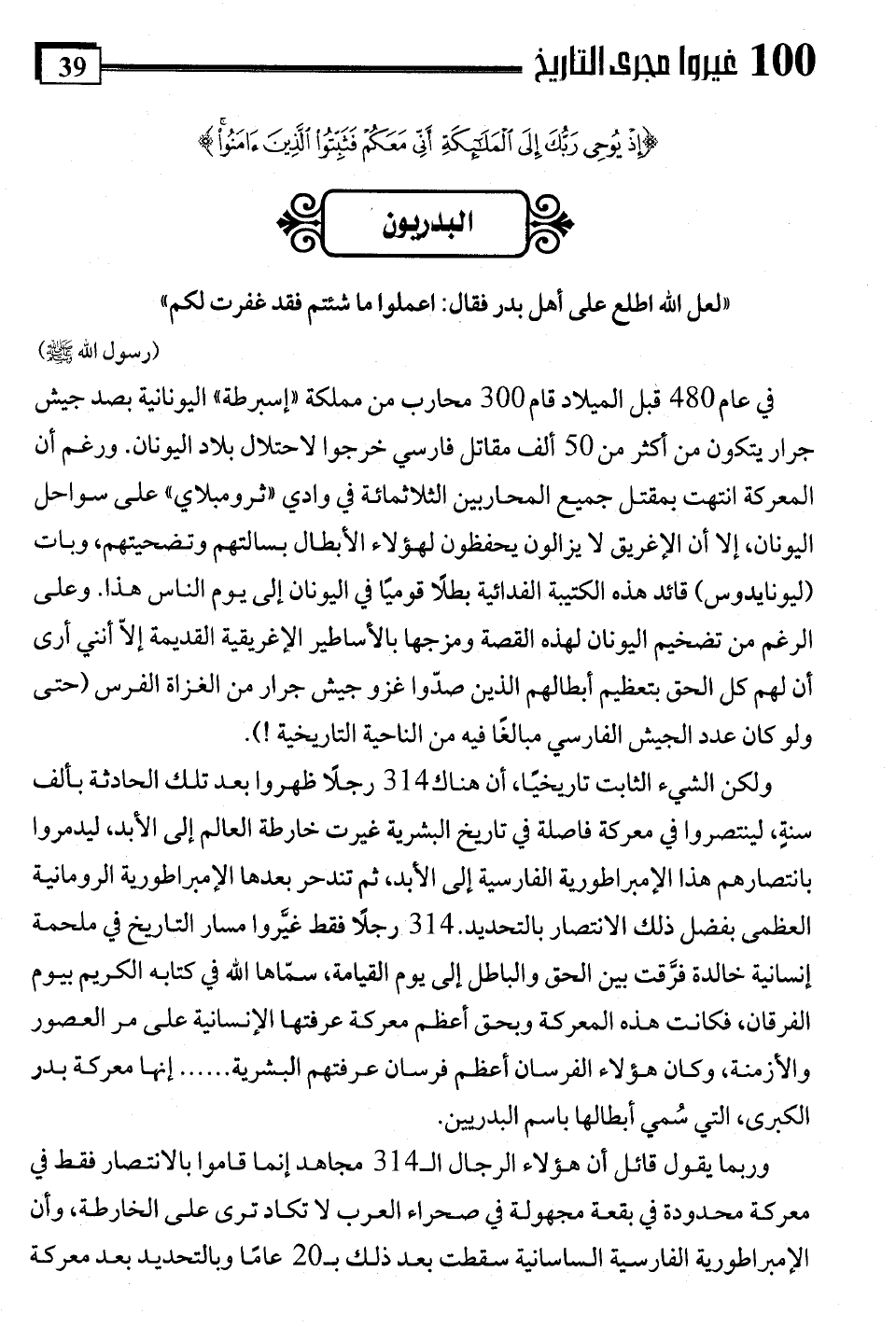 ولكن الشيء الثابت تاريخيًا، أن هناك 314 رجلًا ظهروا بعد تلك الحادثة بألف سنةٍ، لينتصروا في معركة فاصلة في تاريخ البشرية غيرت خارطة العالم إلى الأبد، ليدمروا بانتصارهم هذا الإمبراطورية الفارسية إلى الأبد، ثم تندحر بعدها الإمبراطورية الرومانية العظمى بفضل ذلك الانتصار بالتحديد. 314 رجلًا فقط غيَّروا مسار التاريخ في ملحمة إنسانية خالدة فرَّقت بين الحق والباطل إلى يوم القيامة، سمّاها اللَّه في كتابه الكريم بيوم الفرقان، فكانت هذه المعركة وبحق أعظم معركة عرفتها الإنسانية على مر العصور والأزمنة، وكان هؤلاء الفرسان أعظم فرسان عرفتهم البشرية. . . . إنها معركة بدر الكبرى، التي سُمي أبطالها باسم البدريين.