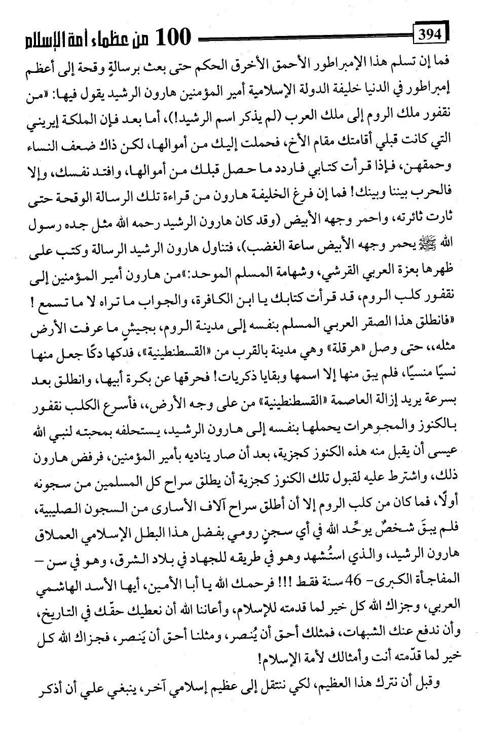 فما إن تسلم هذا الإمبراطور الأحمق الأخرق الحكم حتى بعث برسالةٍ وقحة إلى أعظم إمبراطور في الدنيا خليفة الدولة الإسلامية أمير المؤمنين هارون الرشيد يقول فيها: "من نقفور ملك الروم إلى ملك العرب (لم يذكر اسم الرشيد!)، أما بعد فإن الملكة إيريني التي كانت قبلي أقامتك مقام الأخ، فحملت إليك من أموالها، لكن ذاك ضعف النساء وحمقهن، فإذا قرأت كتابي فأردد ما حصل قبلك من أموالها، وافتد نفسك، وإلا فالحرب بيننا وبينك! فما إن فرغ الخليفة هارون من قراءة تلك الرسالة الوقحة حتى ثارت ثائرته، واحمر وجهه الأبيض (وقد كان هارون الرشيد رحمه اللَّه مثل جده رسول اللَّه -صلى اللَّه عليه وسلم- يحمر وجهه الأبيض ساعة الغضب)، فتناول هارون الرشيد الرسالة وكتب على ظهرها بعزة العربي القرشي، وشهامة المسلم الموحد: "من هارون أمير المؤمنين إلى نقفور كلب الروم، قد قرأت كتابك يا ابن الكافرة، والجواب ما تراه لا ما تسمع! " فانطلق هذا الصقر العربي المسلم بنفسه إلى مدينة الروم، بجيشٍ ما عرفت الأرض مثله،، حتى وصل "هرقلة" وهي مدينة بالقرب من "القسطنطينية"، فدكها دكًا جعل منها نسيًا منسيًا، فلم يبق منها إلا اسمها وبقايا ذكريات! فحرقها عن بكرة أبيها، وانطلق بعد بسرعة يريد إزالة العاصمة "القسطنطينية" من على وجه الأرض، فأسرع الكلب نقفور بالكنوز والمجوهرات يحملها بنفسه إلى هارون الرشيد، يستحلفه بمحبته لنبي اللَّه عيسى أن يقبل منه هذه الكنوز كجزية، بعد أن صار يناديه بأمير المؤمنين، فرفض هارون ذلك، واشترط عليه لقبول تلك الكنوز كجزية أن يطلق سراح كل المسلمين من سجونه أولًا، فما كان من كلب الروم إلا أن أطلق سراح آلاف الأسارى من السجون الصليبية، فلم يبقَ شخصٌ يوحِّد اللَّه في أي سجني رومي بفضل هذا البطل الإسلامي العملاق هارون الرشيد، والذي استُشهد وهو في طريقه للجهاد في بلاد الشرق، وهو في سن -المفاجأة الكبرى- 46 سنة فقط!!! فرحمك اللَّه يا أبا الأمين، أيها الأسد الهاشمي العربى، وجزاك اللَّه كل خير لما قدمته للإسلام، وأعاننا اللَّه أن نعطيك حقّك في التاريخ، وأن ندفع عنك الشبهات، فمثلك أحق أن يُنصر، ومثلنا أحق أن يَنصر، فجزاك اللَّه كل خير لما قدّمته أنت وأمثالك لأمة الإسلام!