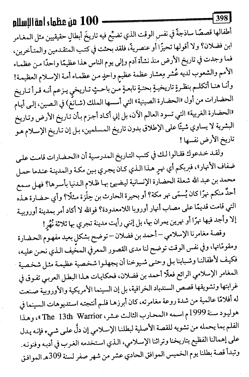 أطفالها قصصًا ساذجةً في نفس الوقت الذي تضيِّع فيه تاريخَ أبطالٍ حقيقيين مثل المغامر ابن فضلان؟ ولا أقولها تحيزًا أو عنصريةً، فلقد بحثت في كتب المتقدمين والمتأخرين، فما وجدت في تاريخ الأرض منذ نشأة آدم وإلى يوم الناس هذا عظيمًا واحدًا من عظماء الأمم والشعوب لديه عُشر مِعشار عظمة عظيمٍ واحدٍ من عظماء أمة الإسلام العظيمة! وأنا هنا أتكلم بنظرةٍ تاريخيةٍ بحتةٍ نابعةٍ من باحثٍ تاريخيٍ يزعم أنه قرأ تاريخ الحضارات من أول "الحضارة الصينية" التي أسسها الملك (شانغ) في الصين، إلى أيام "الحضارة الغربية" التي تسود العالم الآن، بل إني اكاد أجزم بأن تاريخ الأرض وتاريخ البشرية لا يساوي شيئًا على الإطلاق بدون تاريخ المسلمين، بل إن تاريخ الإسلام هو تاريخ الأرض نفسها!