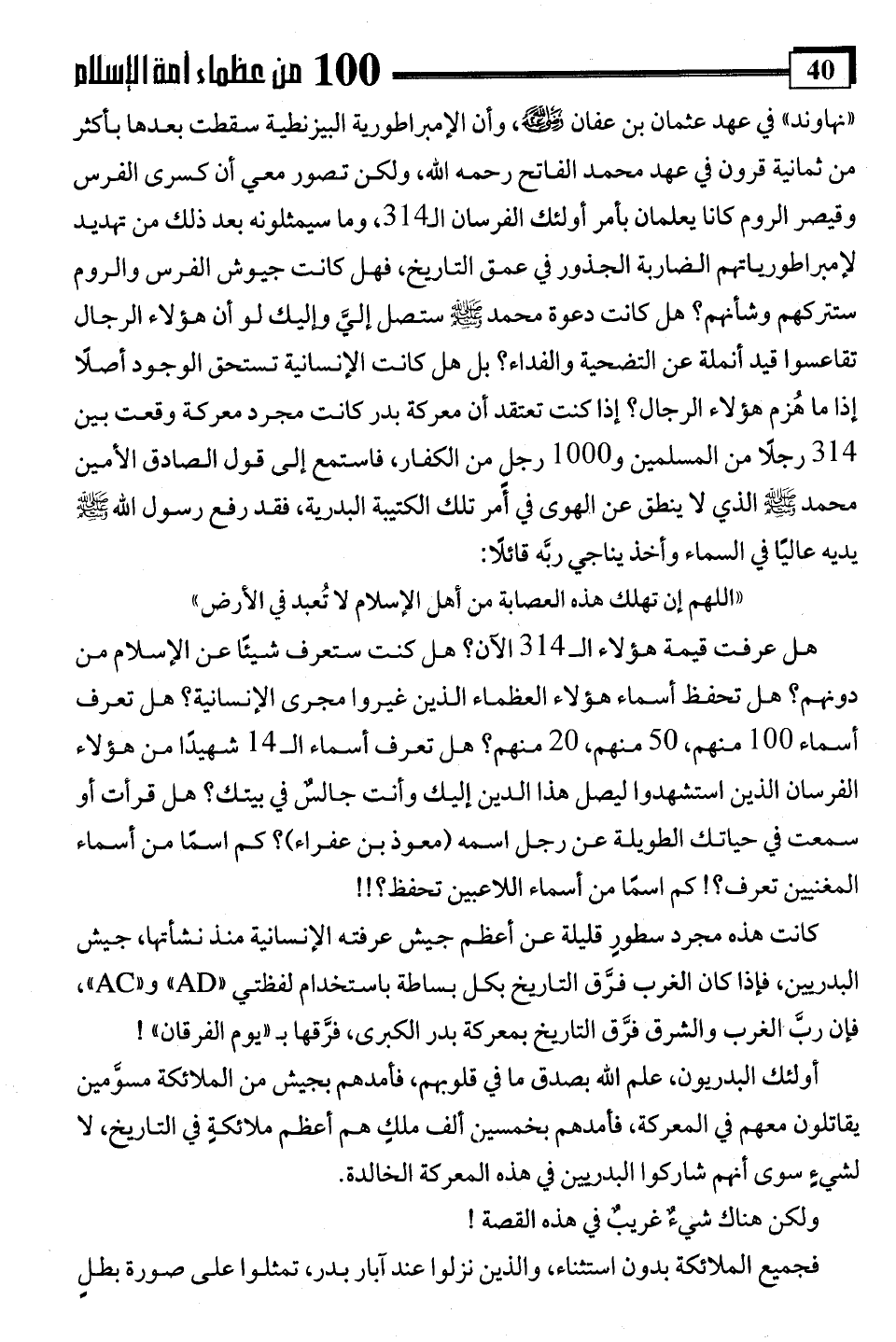 هل عرفت قيمة هؤلاء الـ 314 الآن؟ هل كنت ستعرف شيئًا عن الإسلام من دونهم؟ قال تحفظ أسماء هؤلاء العظماء الذين غيروا مجرى الإنسانية؟ هل تعرف أسماء 100 منهم، 50 منهم، 20 منهم؟ هل تعرف أسماء الـ 14 شهيدًا من هؤلاء الفرسان الذين استشهدوا ليصل هذا الدين إليك وأنت جالسٌ في بيتك؟ هل قرأت أو سمعت في حياتك الطويلة عن رجل اسمه (معوذ بن عفراء)؟ كم اسمًا من أسماء المغنيين تعرف؟! كم اسمًا من أسماء اللاعبين تحفظ؟!!