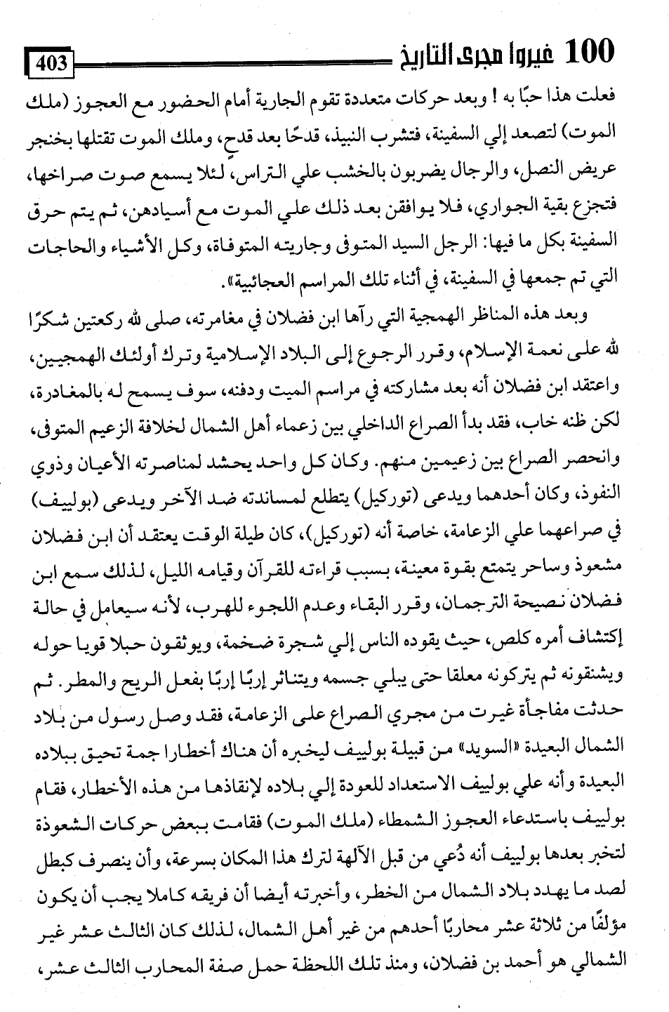 وبعد هذه المناظر الهمجية التي رآها ابن فضلان في مغامرته، صلى للَّه ركعتين شكرًا للَّه على نعمة الإسلام، وقرر الرجوع إلى البلاد الإسلامية وترك أولئك الهمجيين، واعتقد ابن فضلان أنه بعد مشاركته في مراسم الميت ودفنه، سوف يسمح له بالمغادرة، لكن ظنه خاب، فقد بدأ الصراع الداخلي بين زعماء أهل الشمال لخلافة الزعيم المتوفى، وانحصر الصراع بين زعيمين منهم. وكان كل واحد يحشد لمناصرته الأعيان وذوي النفوذ، ووإن أحدهما ويدعى (توركيل) يتطلع لمساندته ضد الآخر ويدعى (بولييف) في صراعهما علي الزعامة، خاصة أنه (توركيل)، كان طيلة الوقت يعتقد أن ابن فضلان مشعوذ وساحر يتمتع بقوة معينة، بسبب قراءته للقرآن وقيامه الليل، لذلك سمع ابن فضلان نصيحة الترجمان، وقرر البقاء وعدم اللجوء للهرب، لأنه سيعامل في حالة إكتشاف أمره كلص، حيث يقوده الناس إلي شجرة ضخمة، ويوثقون حبلا قويا حوله ويشنقونه ثم يتركونه معلقا حتى يبلي جسمه ويتناثر إربًا إربًا بفعل الريح والمطر. ثم حدثت مفاجأة غيرت من مجري الصراع على الزعامة، فقد وصل رسول من بلاد الشمال البعيدة "السويد" من قبيلة بولييف ليخبره أن هناك أخطارا جمة تحيق ببلاده البعيدة وأنه علي بولييف الاستعداد للعودة إلي بلاده لإنقاذها من هذه الأخطار، فقام بولييف باستدعاء العجوز الشمطاء (ملك الموت) فقامت ببعض حركات الشعوذة لتخبر بعدها بولييف أنه دُعي من قبل الآلهة لترك هذا المكان بسرعة، وأن ينصرف كبطل لصد ما يهدد بلاد الشمال من الخطر، وأخبرته أيضًا أن فريقه كاملا يجب أن يكون مؤلفًا من ثلاثة عشر محاربًا أحدهم من غير أهل الشمال، لذلك كان الثالث عشر غير الشمالي هو أحمد بن فضلان، ومنذ تلك اللحظة حمل صفة المحارب الثالث عشر،
